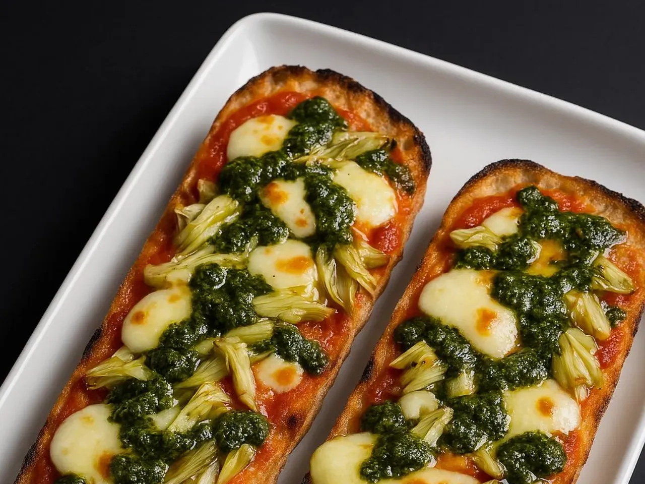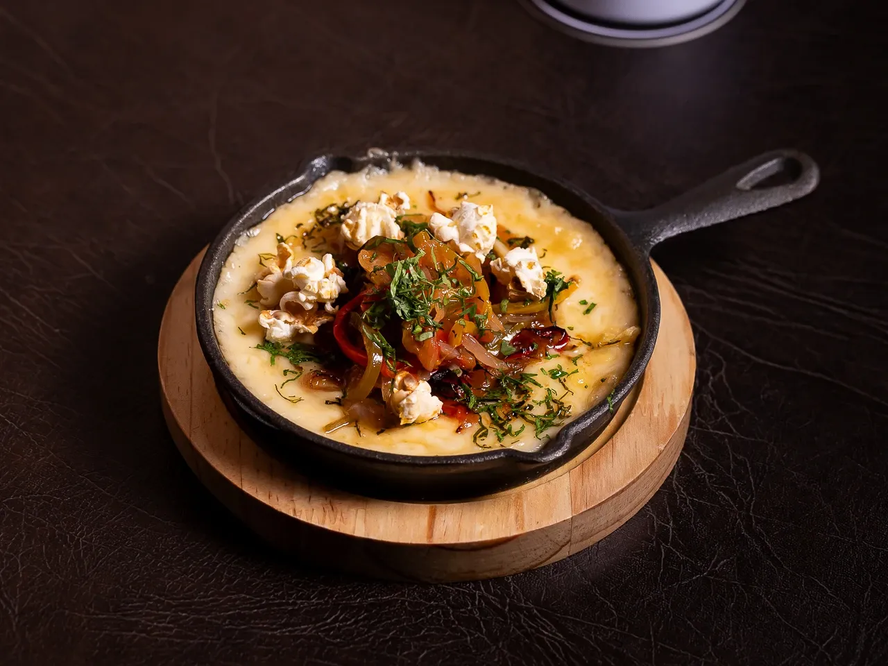 Queso provoleta fundido con verduras salteadas, tostadas y hojas frescas con oliva