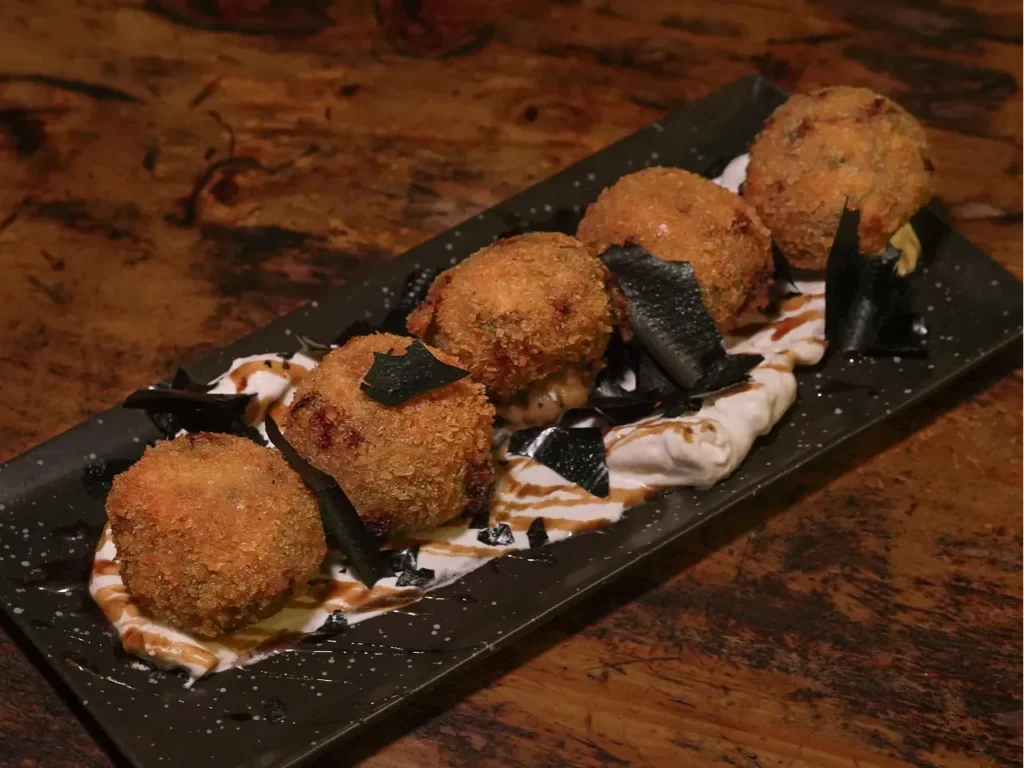 Croqueta de camarón en tempura de tinta de sepia, pure de coliflor confitada, mayo acevichada, y encurtidos de cebolla y semillas de mostaza.
