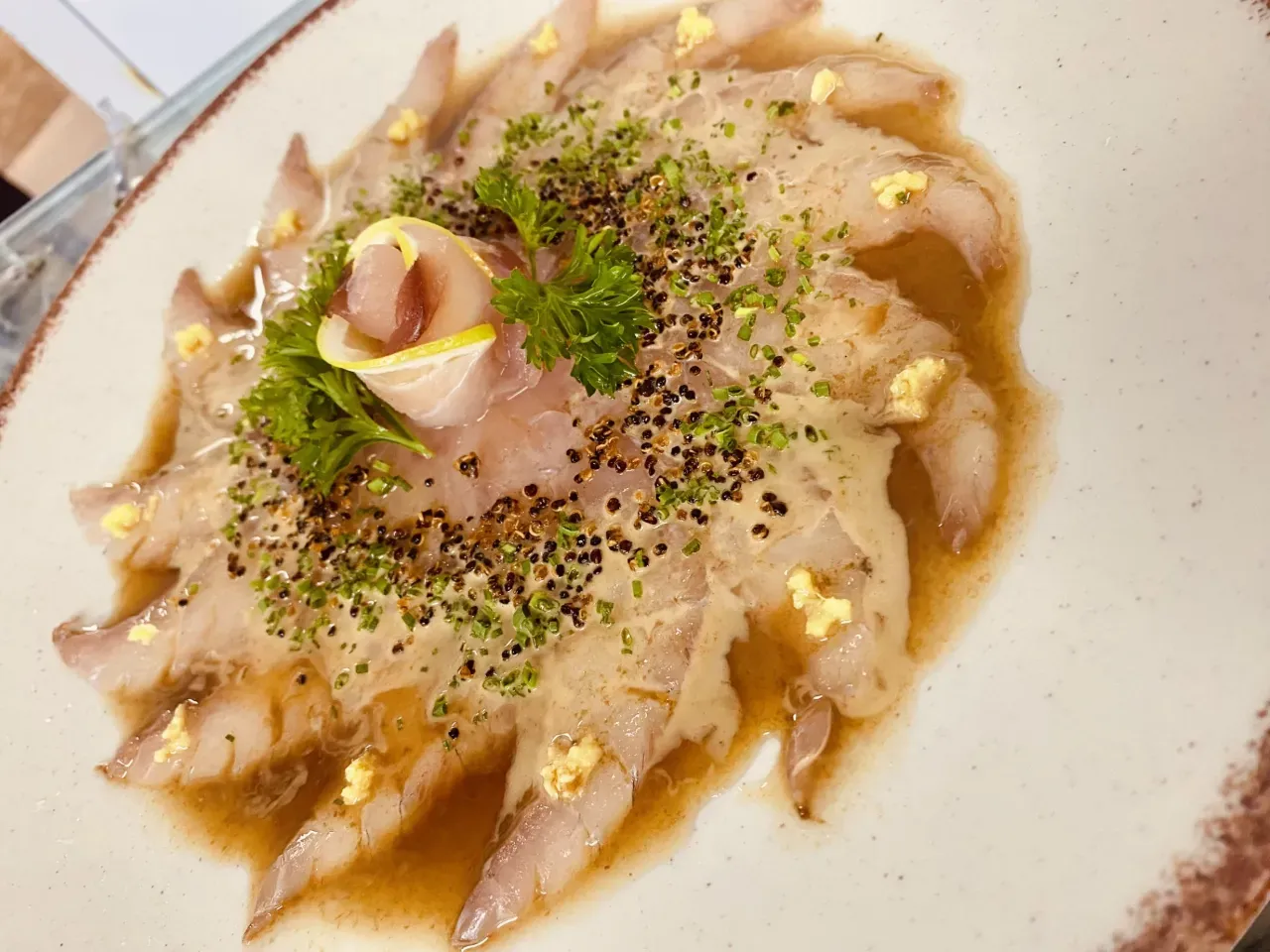 Trozos crudos del pescado del día, con clásica salsa ponzu levemente cítrica, castañas de caju tostadas, cebolla, rocoto, cilantro y katsuobuchi.