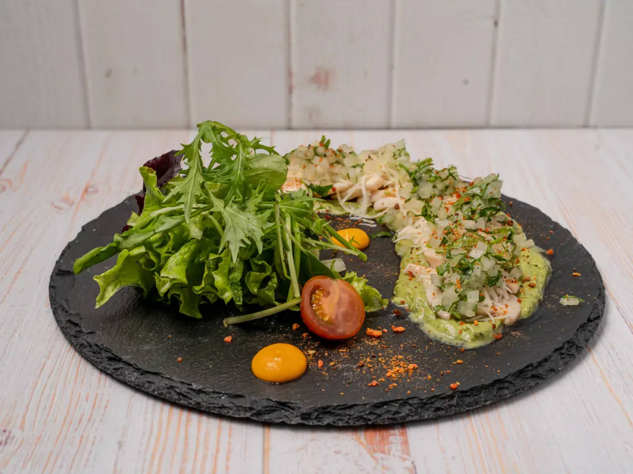 Reineta marinada en nuestra leche de tigre con el toque perfecto de acidez, coronado con palta