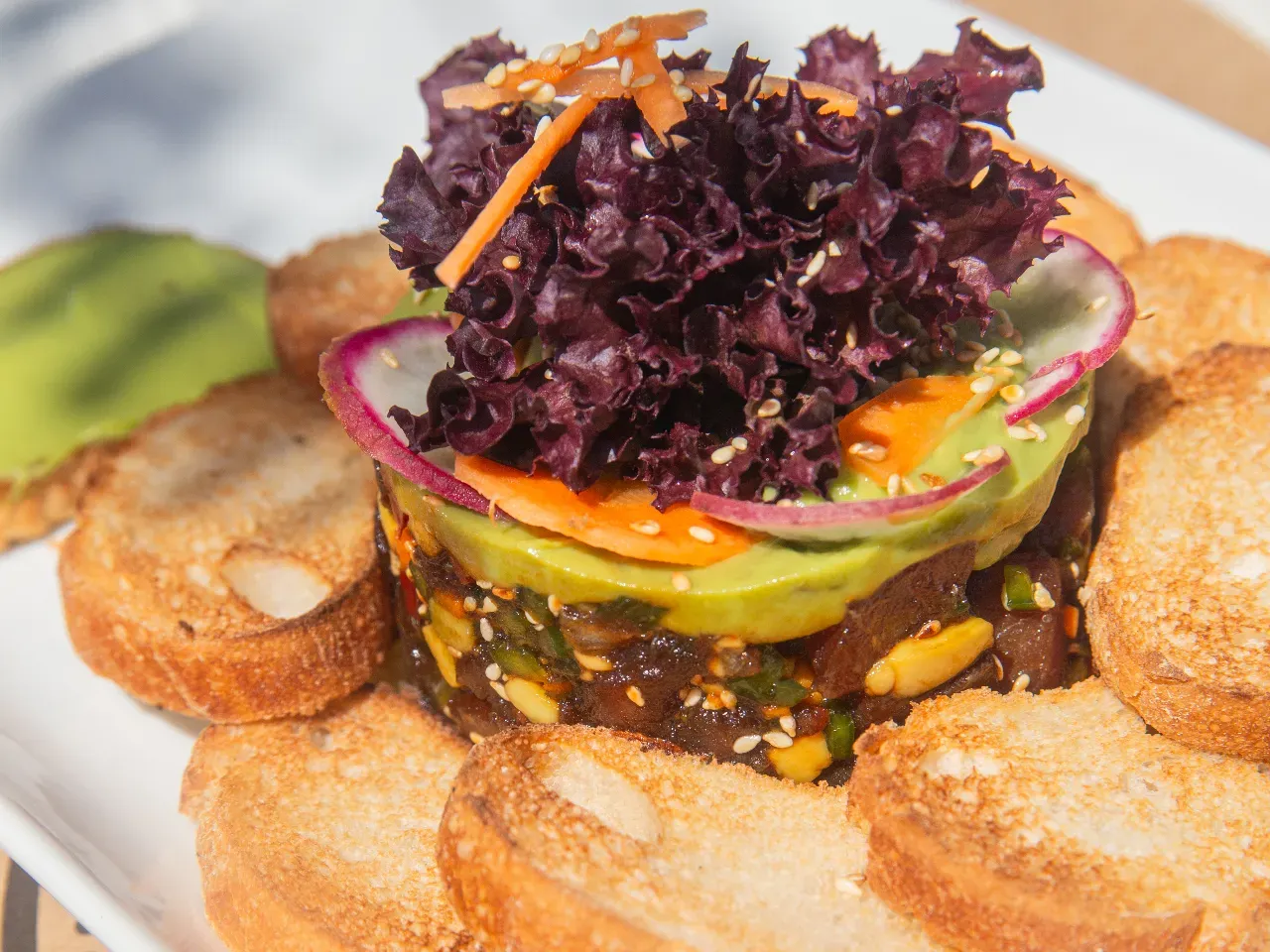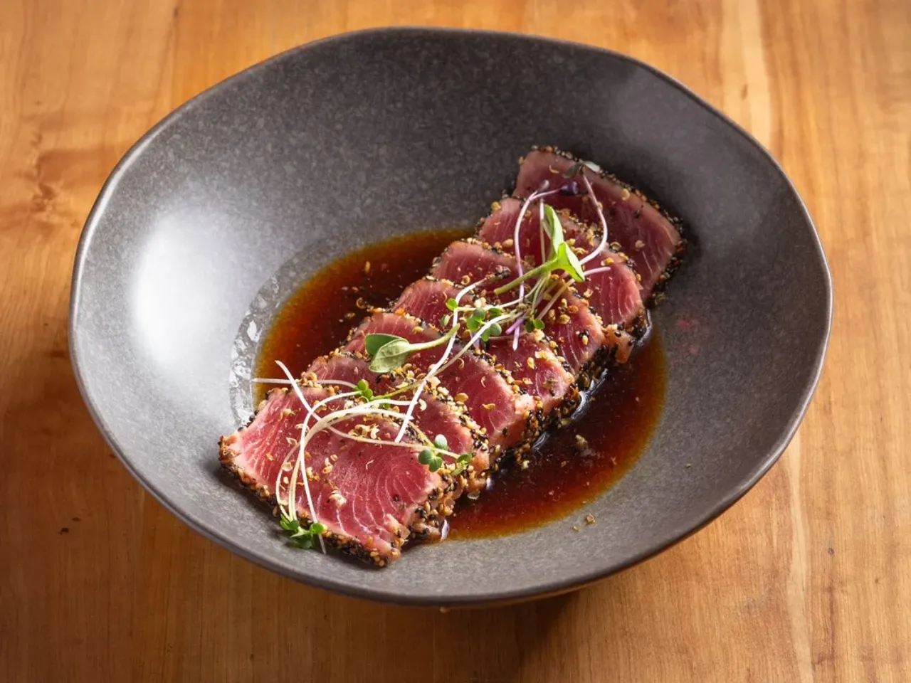 Atún sellado con mix de sésamos acompañado de crema de palta, salsa de olivo, hojas verdes y salsa tonkatsu