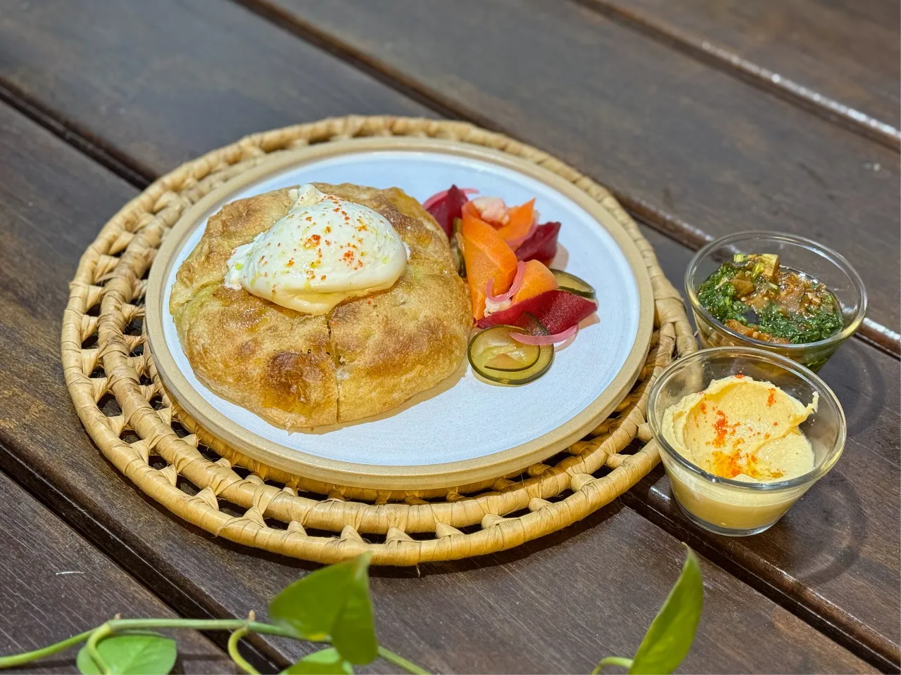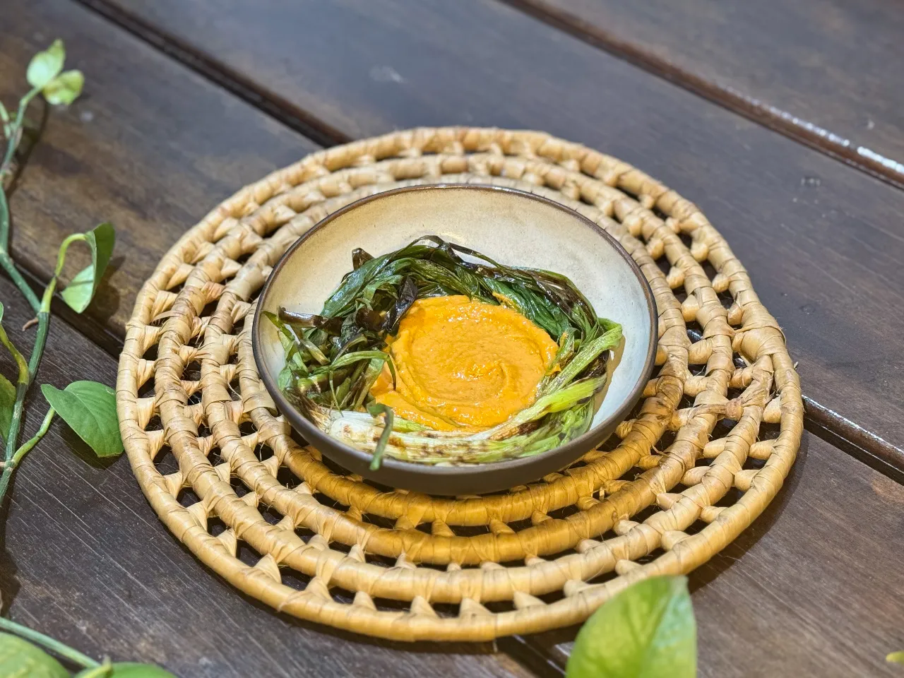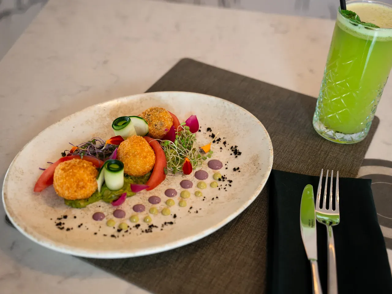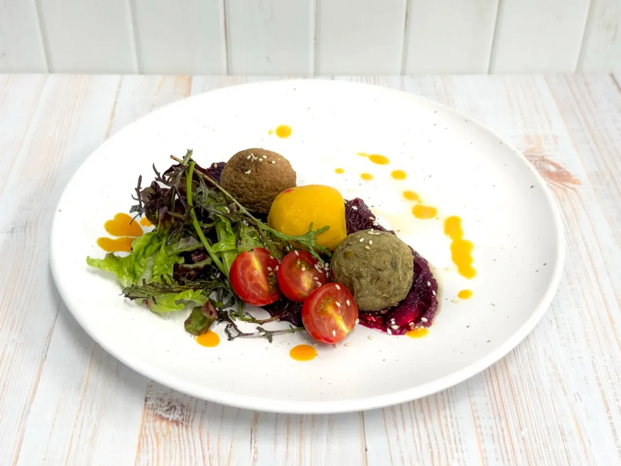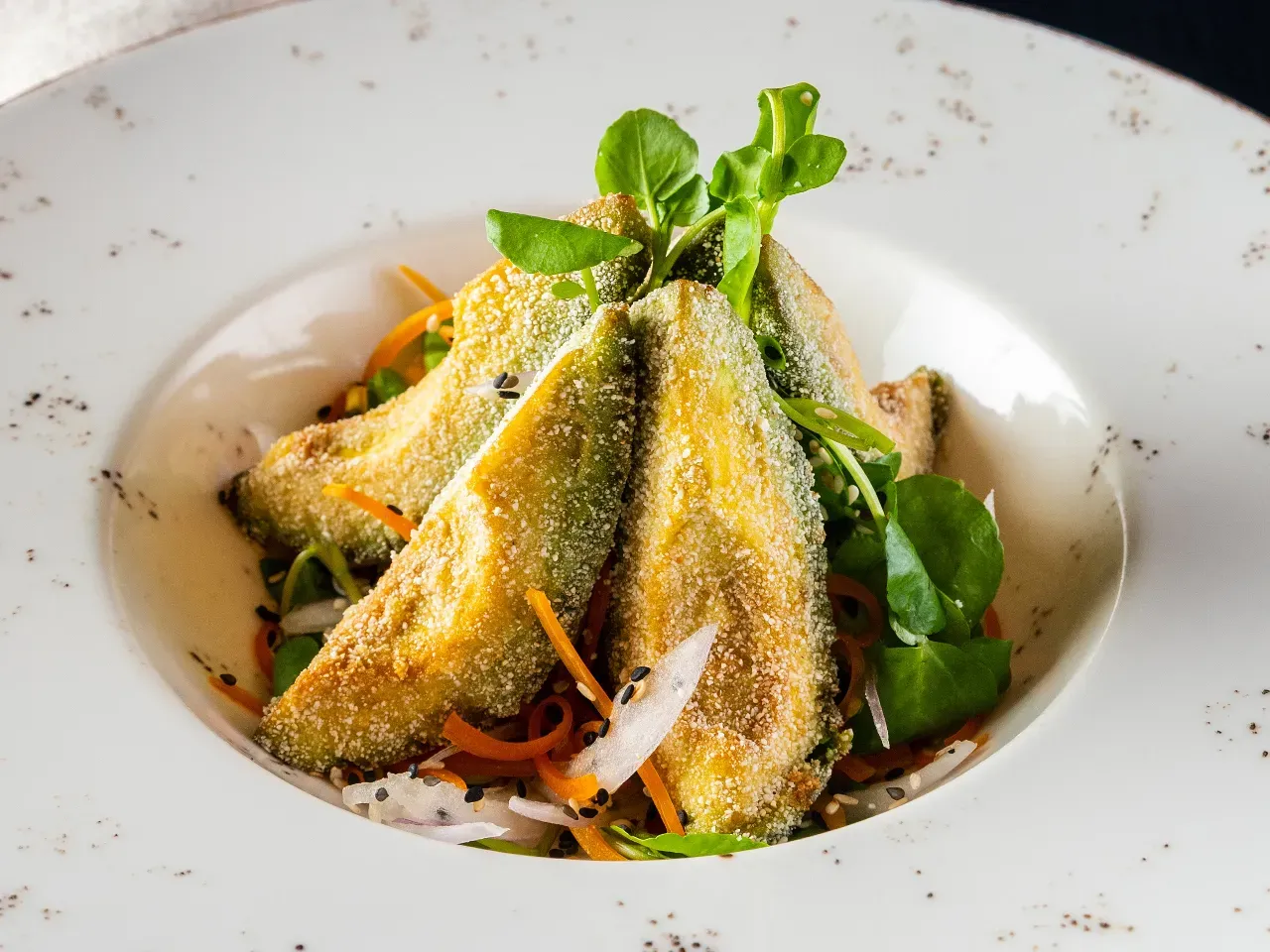 Crujientes medallones de Berenjena y Zucchini, pasados por batido de harina de garbanzos y especias, respetando la receta tradicional india. Acompañado de salsa fresca de tomate-pepino y de cremoso de cacho de cabra.