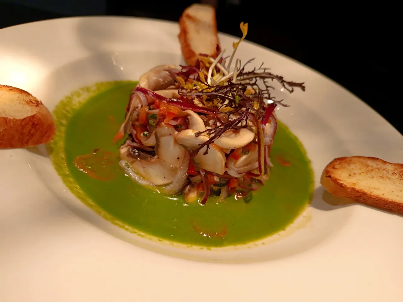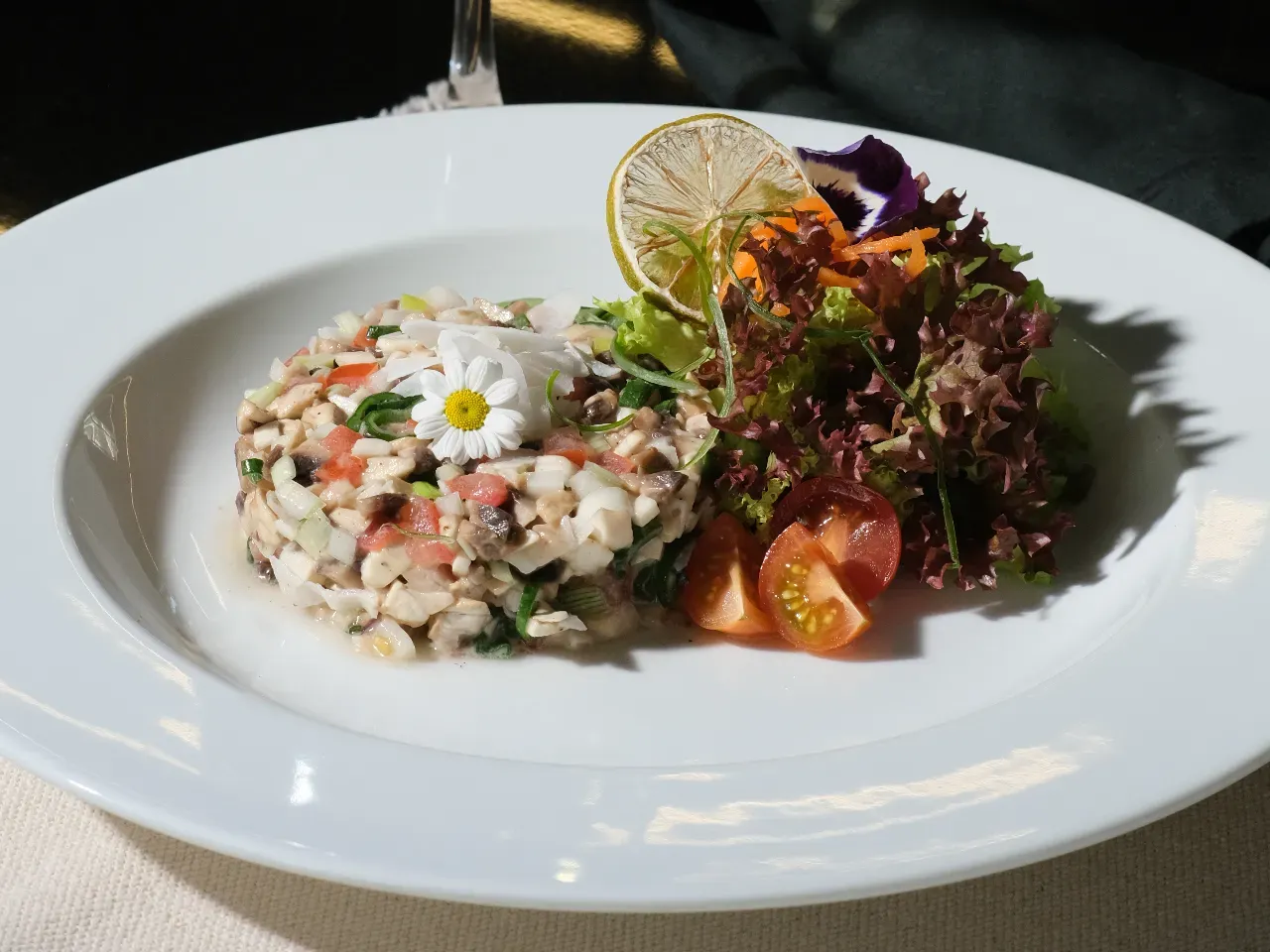 Ceviche de champiñones mixtos con limon, cilantro, rocoto suave, cebolla morada, pimentones frescos y hojas verdes con aceite de oliva