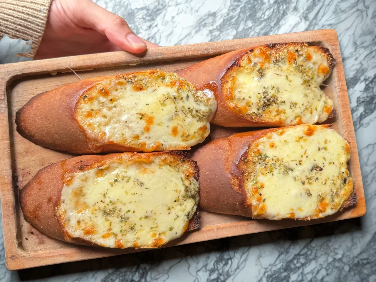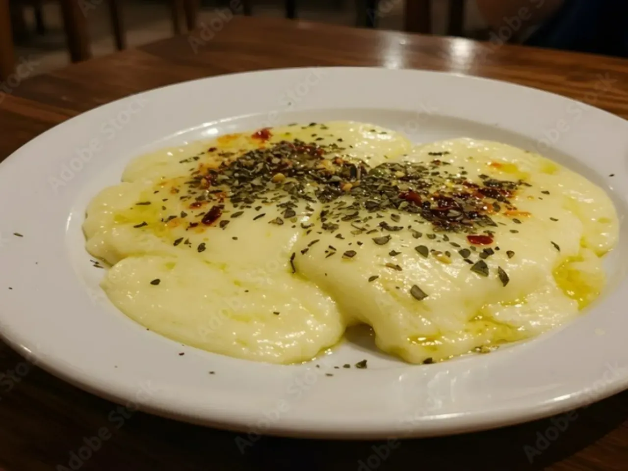 Provoleta de quesos acompañada de hierbas de Provenza y pan frances.