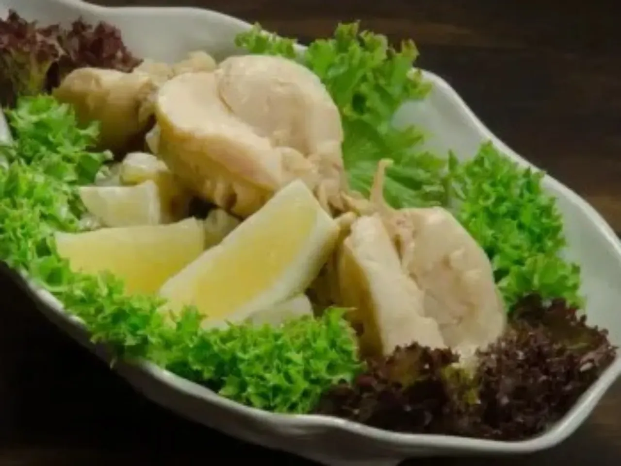 Presa de pollo trozada perfecta para picotear, acompañada de mayo F (mayonesa de choclo), coleslaw menta/limón y rabanitos encurtidos.