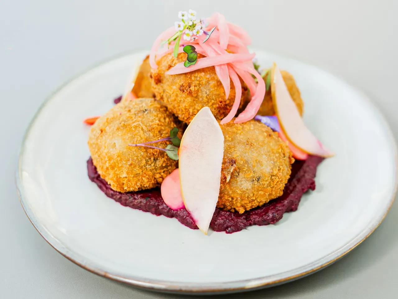 croquetas de cerdo acompañadas de puré de manzana y encurtidos.