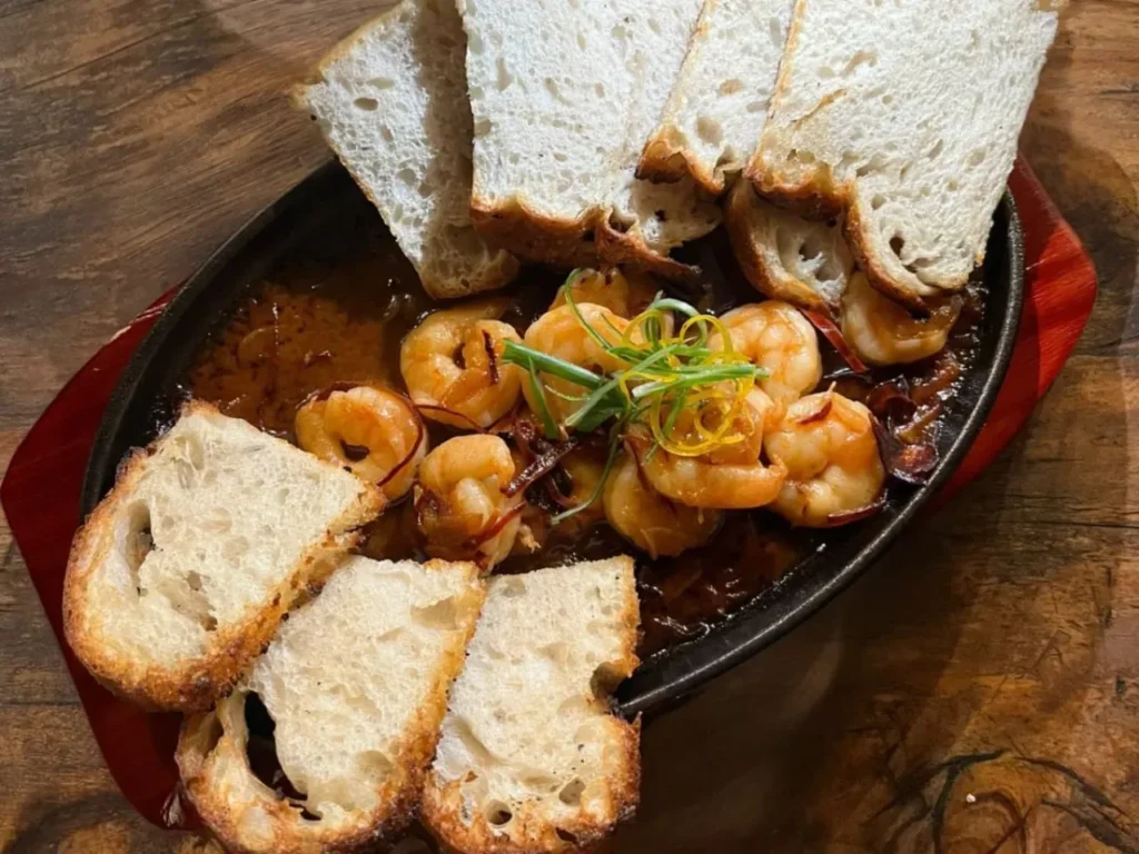 11 camarones salteados con mantequilla, vino blanco, ají cacho de cabra y tiernos ajos. Acompañados de tostadas de la casa.
