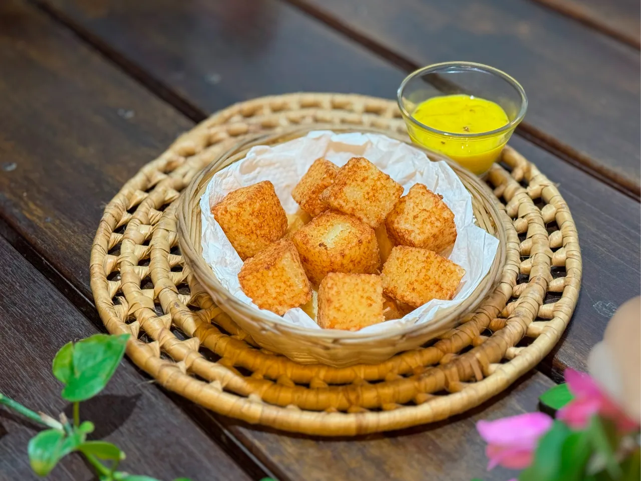 Crujientes bocados de queso prensado marinados en 18 especies con un dip de maní y naranja
