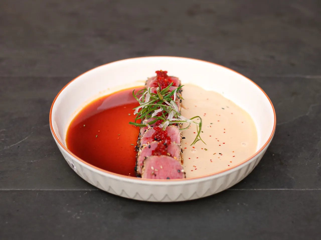 Cortes de atun sellados con togarashi en salsa de soya, citricos, aromas de anís estrella, praliné de almendras, carpaccio de palta y quinoa crocante