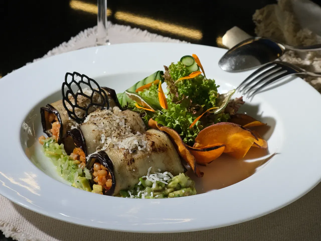Suaves crepes rellenos de verduras al wok, champiñones y salsa bechamel. Gratinados en queso mantecoso.