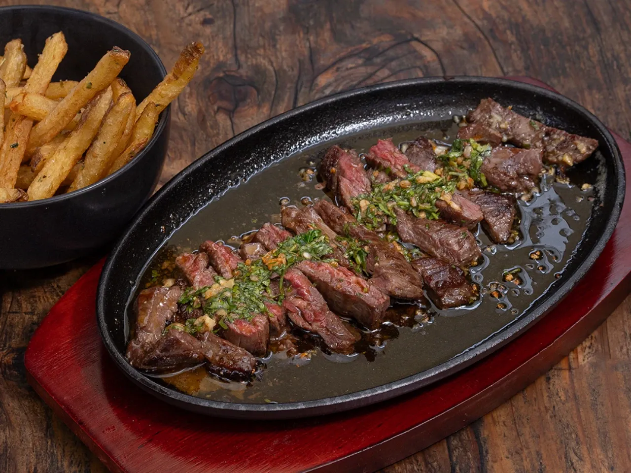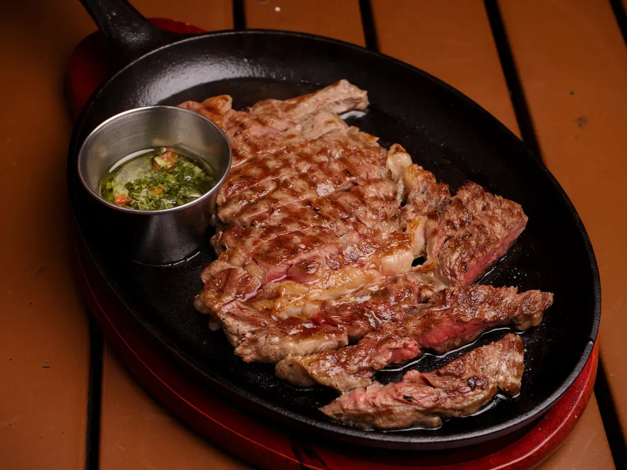 A la parrilla bañada en chimichurri típico argentino, acompañada de papas rústicas.