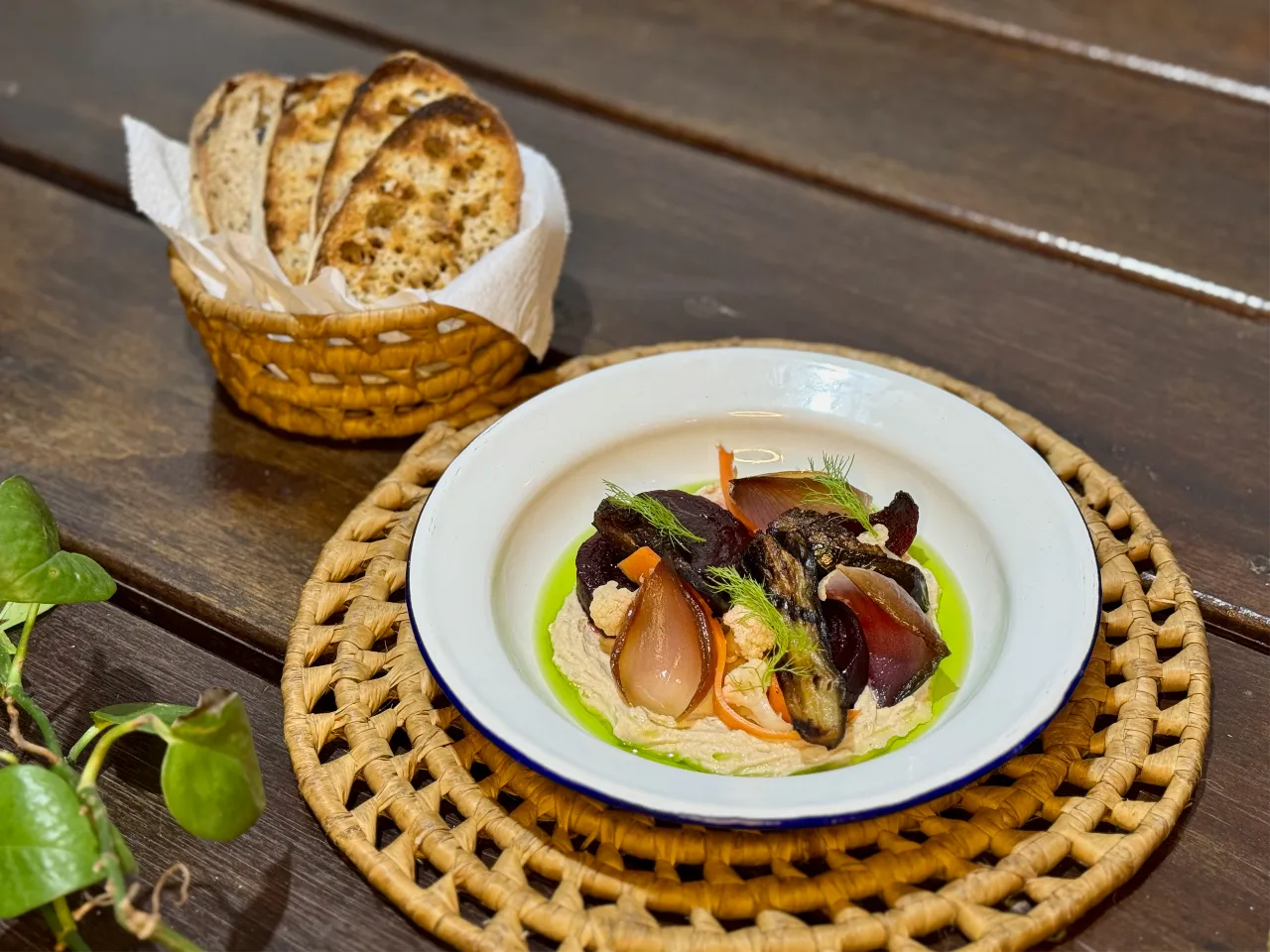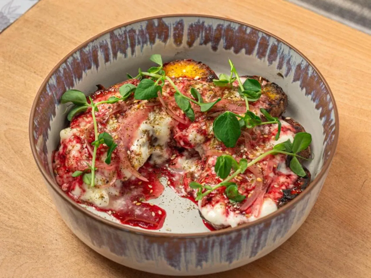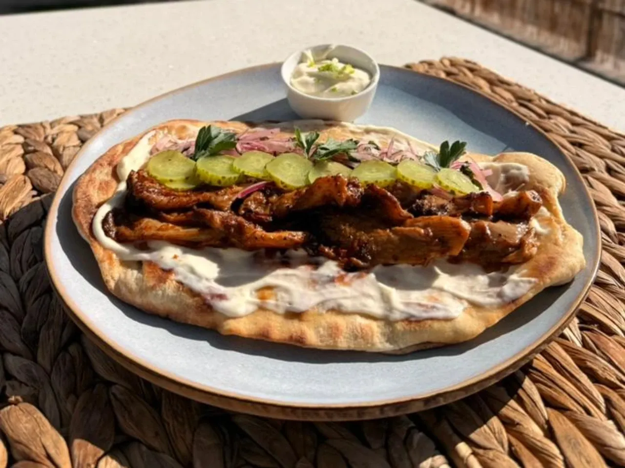 Shawarma con Setas Ostra asadas, con lactonesa de ajo, pepinillos y cebolla de zumaque (vinagre de vino tinto). Plato de chef Alfie Steiner.