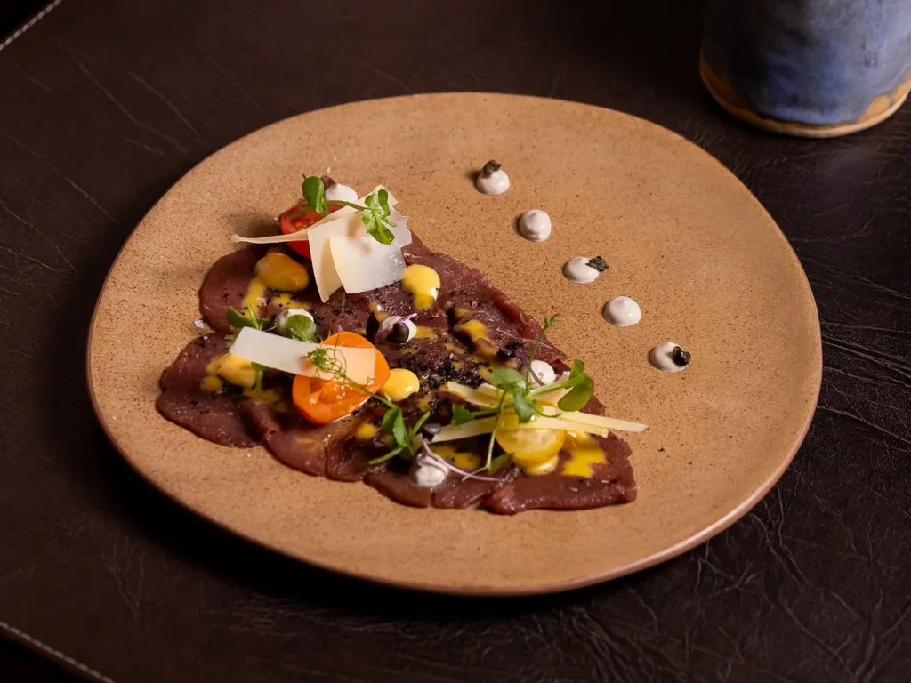 Finas láminas de filete, alcaparras, rúcula, parmesano y tostadas de baguette con oliva y ajo.