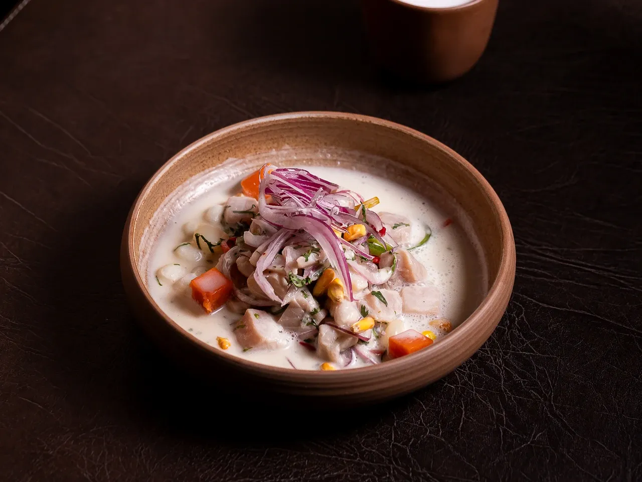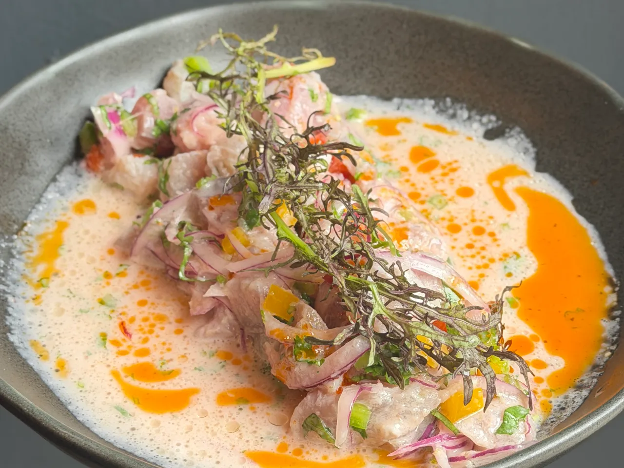 Pesca Blanca, cebolla morada, leche de tigre, camote tempura, canchita y finas laminas de pimentón.