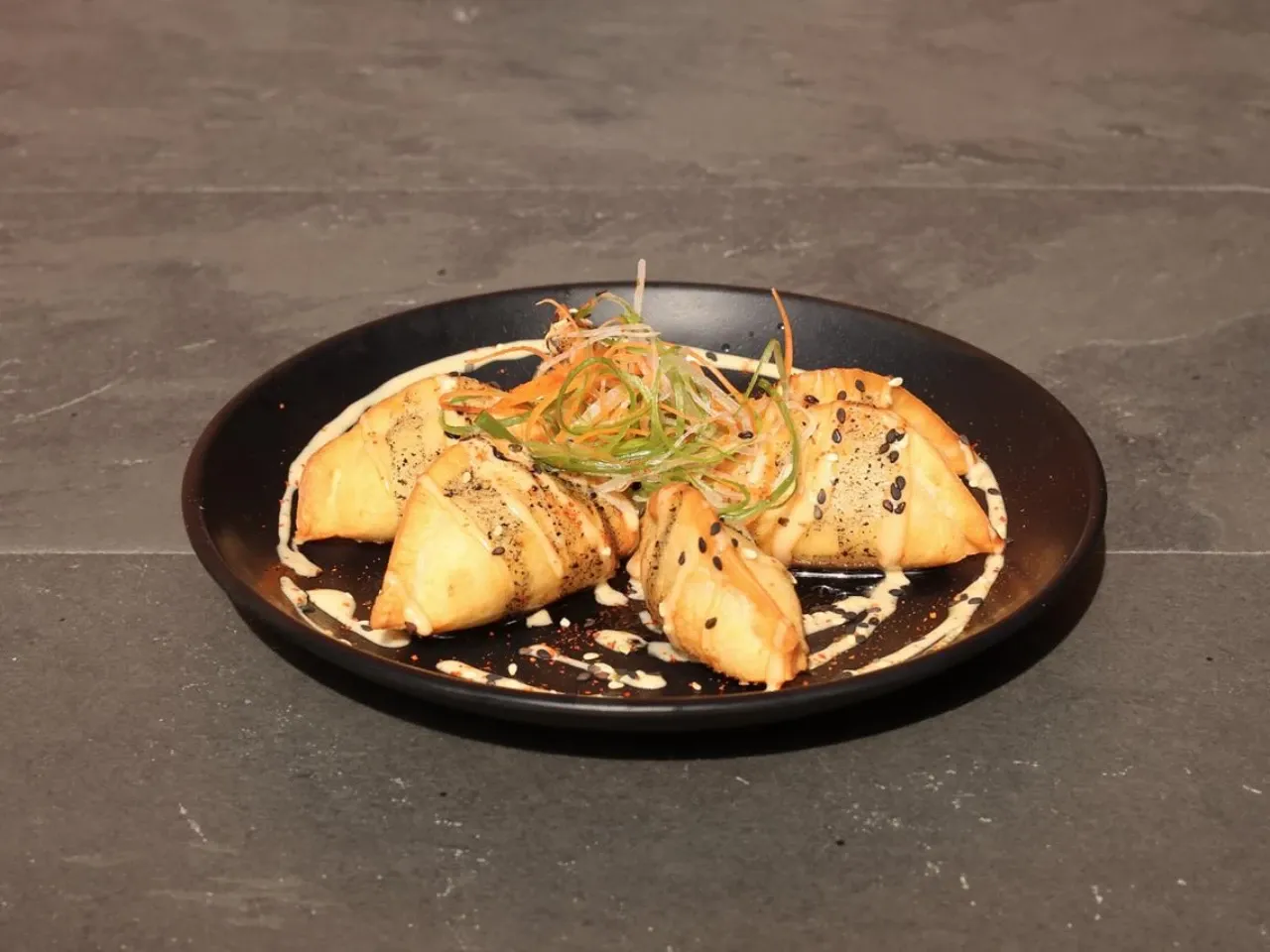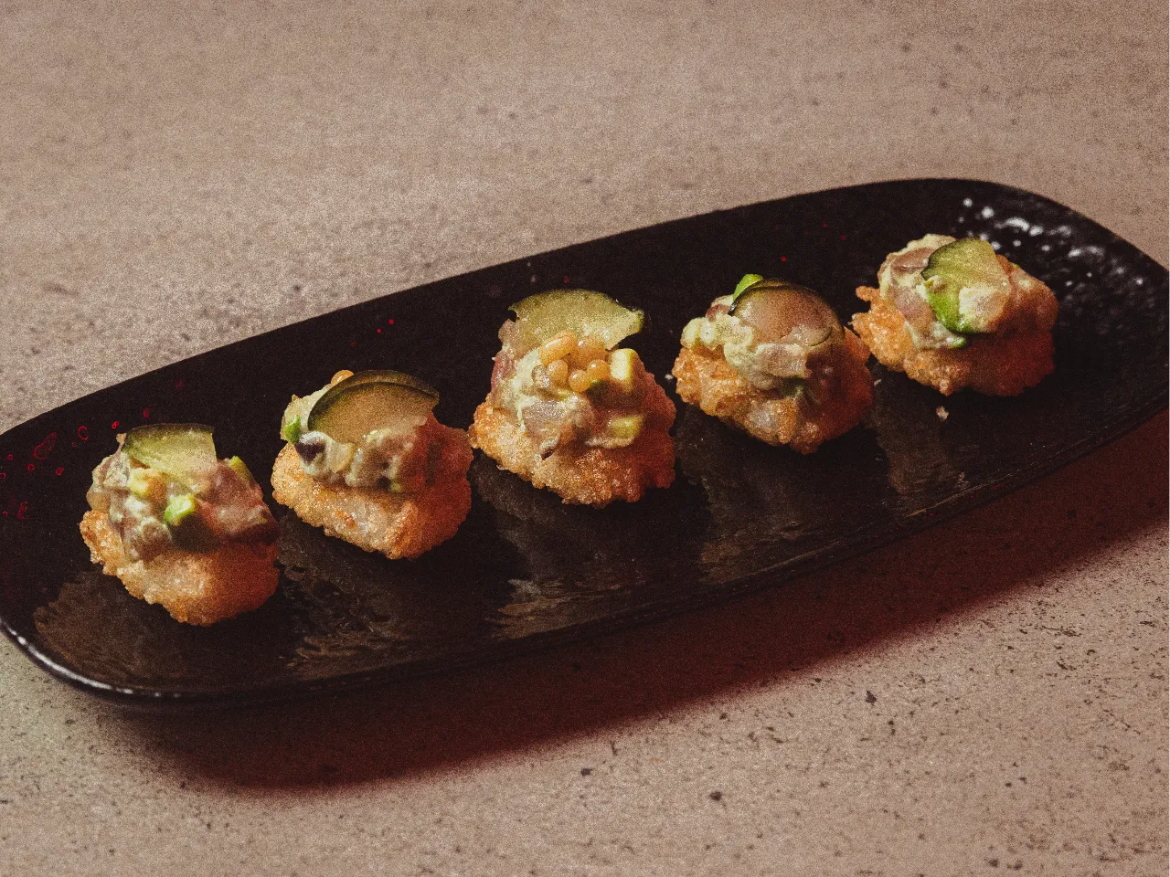 Relleno de tofu crocante, pepino encurtido y compota de plátano con piña, cubierto de palta y quinoa inflada. Bañado en salsa tare y coronado con mayo spicy
