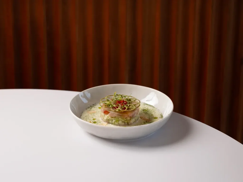 Reineta fresca marinada en jugo de limón y leche de tigre, con cebolla morada, cilantro fresco, ají y jengibre. Acompañado de maíz cancha, choclo peruano, camote y tostadas con mantequilla.