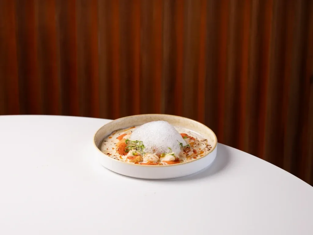 Sopaipillitas crocantes de masa Segreta con salmón en salsa acevichada, aceite de sésamo y nuestras clásicas leches de trigre de maracuyá, tradicional y picante