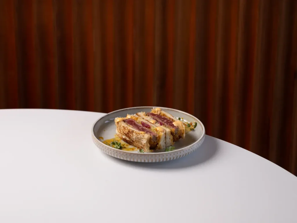 Dos versiones en equilibrio: frescura marina con salmón e ikura, carácter cárnico con roast beef y salsa steak