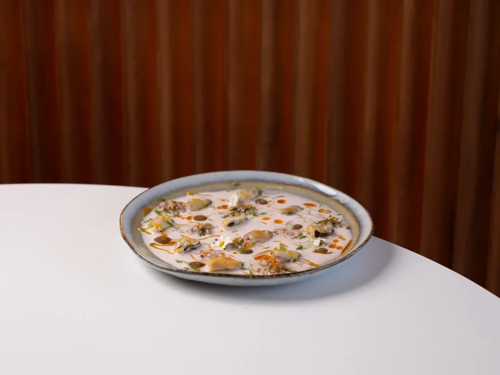 Laminas de ostión sobre agua chile de maracuyá/pepino, ají cristal, betarraga asada, y aceite verde.