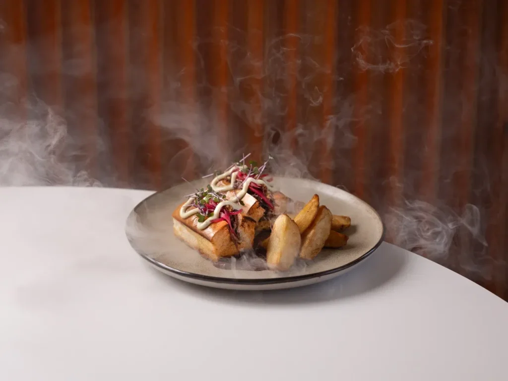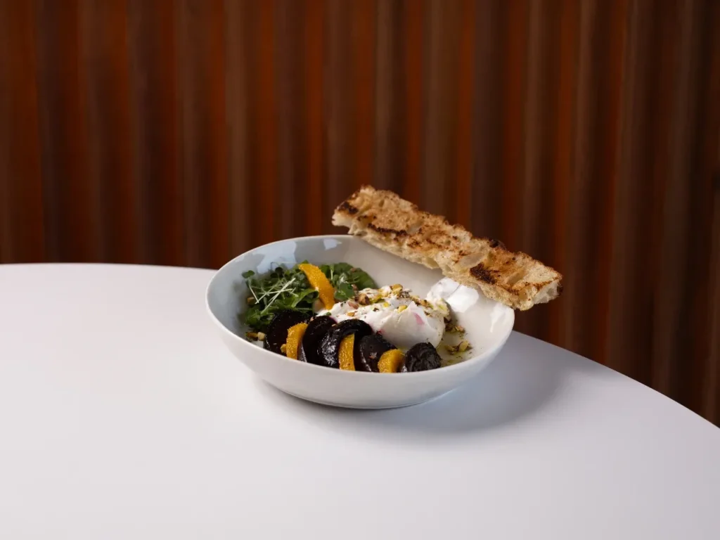 Betarraga asada en gajos con burrata fresca, pistachos tostados, gajos de naranja y brotes tiernos, acompañada de un delicado balsamico blanco. Tostada de focaccia.