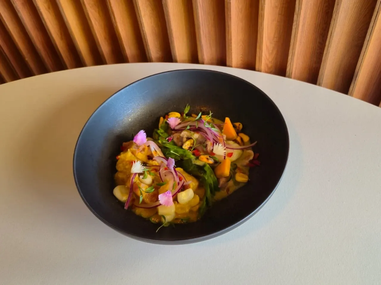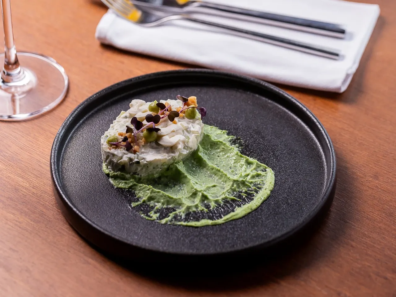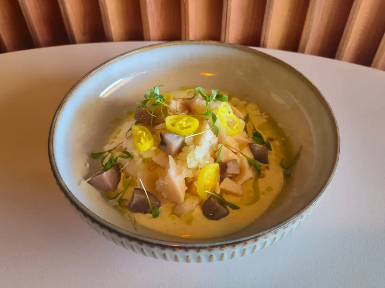 Ceviche de chontaduro y coco, chips de plátano y alioli de limón mandarino.