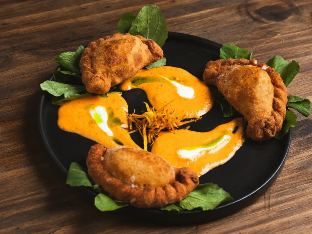 Empanaditas japonesas rellenas de verduras acompañadas de salsa teriyaki y salsa acevichada