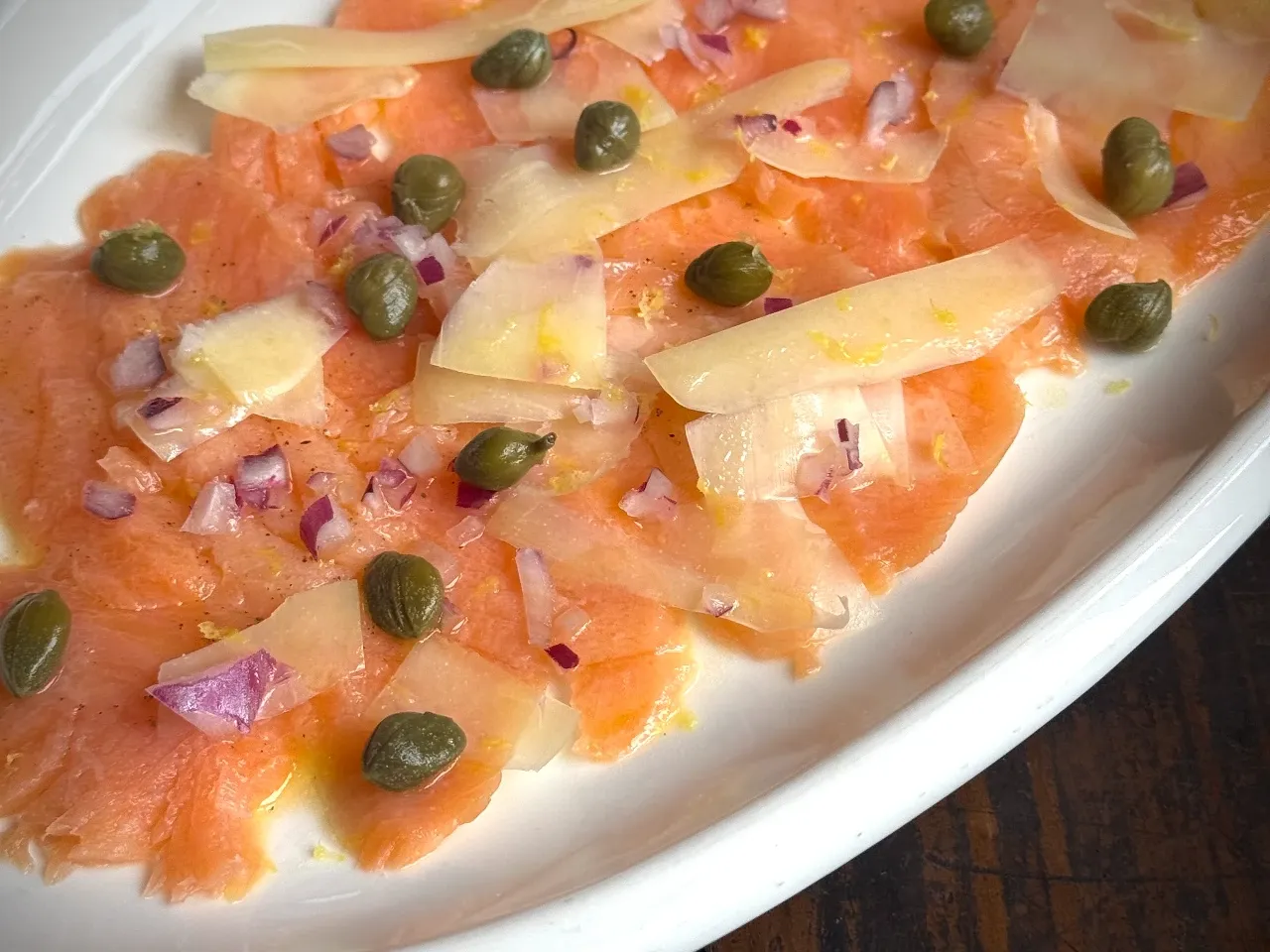 Tiradito de salmón curado en cítricos con acevichada de palta, cebolla encurtida con chicharrón de longaniza