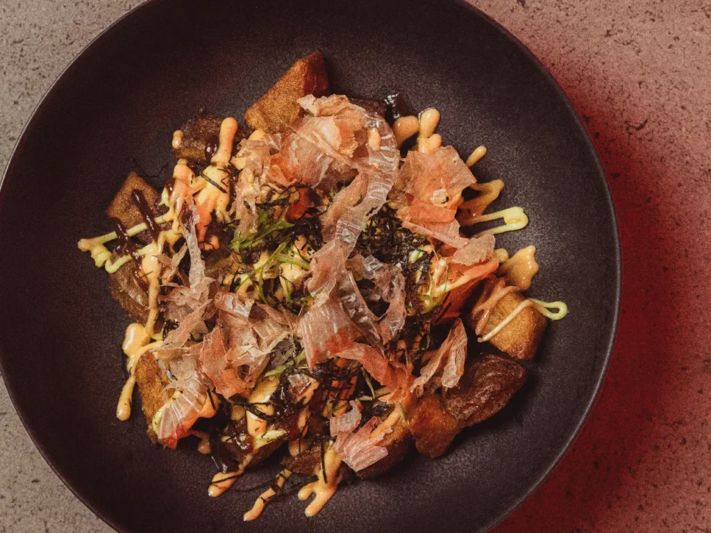 Papas fritas con piel, crujientes, tamarindo, kewpie y sriracha. Katsobushi que baila y furikake KATO para coronar.