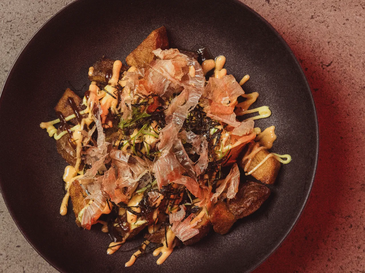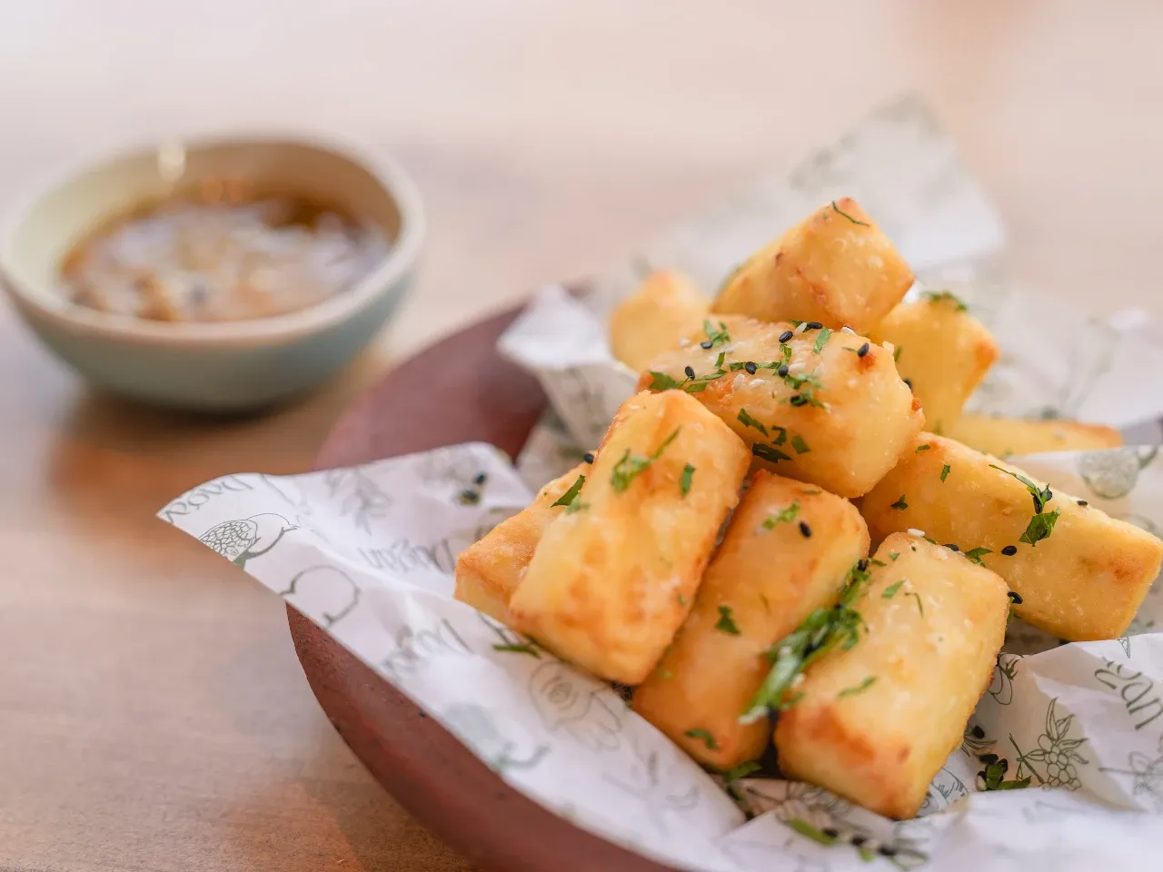 Pequeños trozos de tofu frito en caldo tempura y katsuobushi