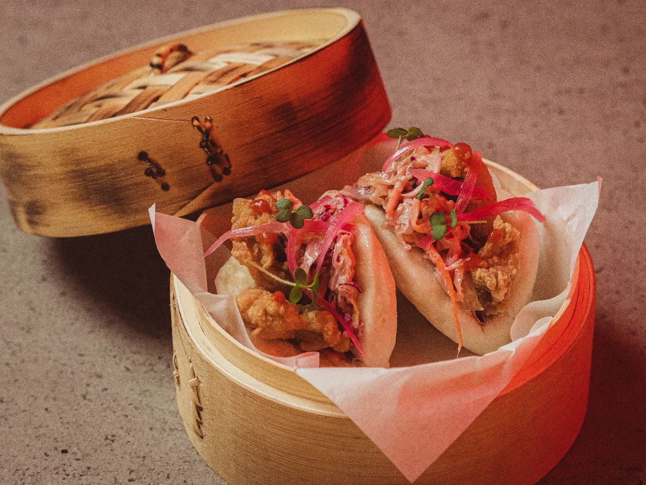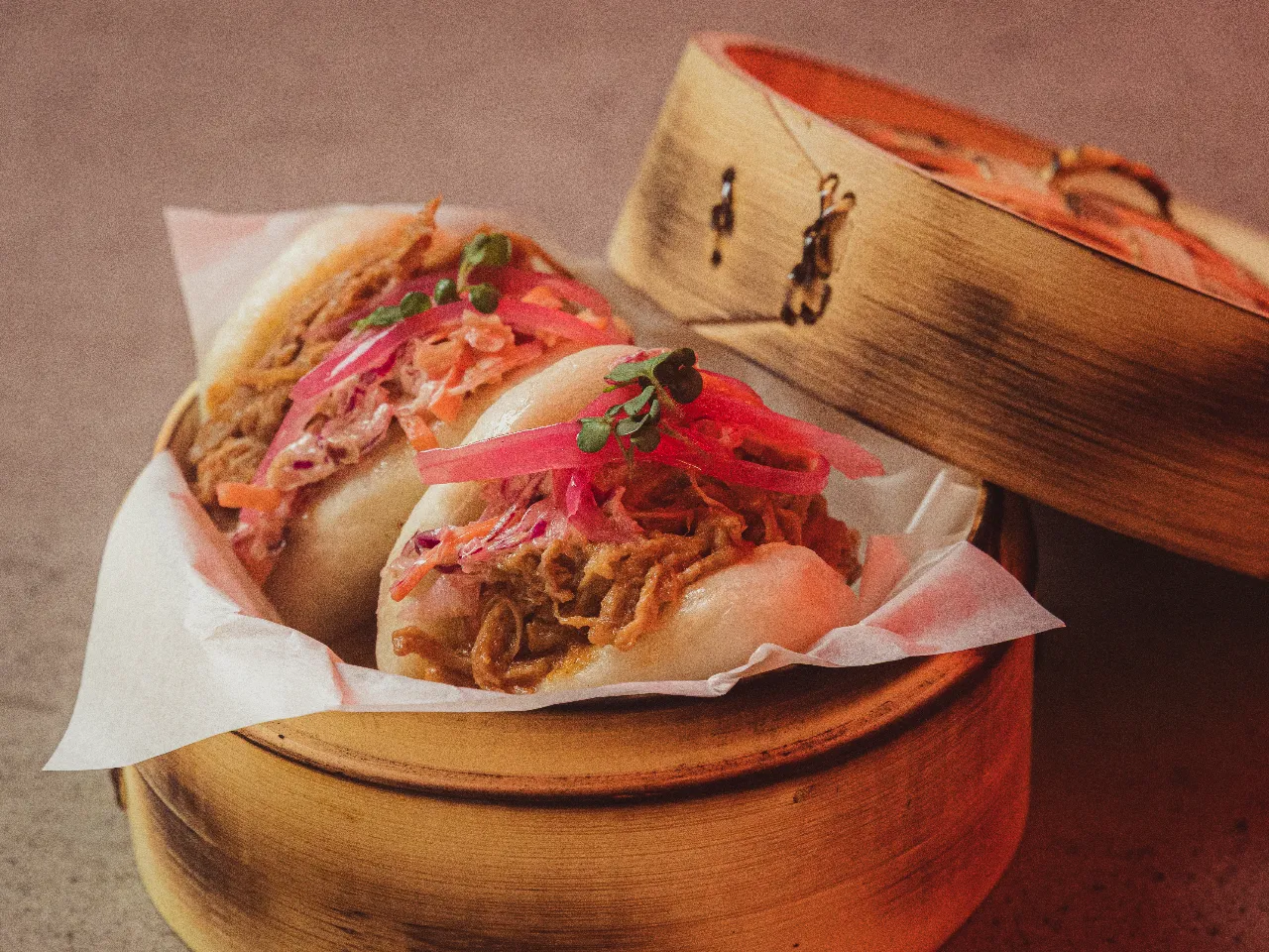 Pancitos al vapor acompaños con charsiu e encurtidos de pepino