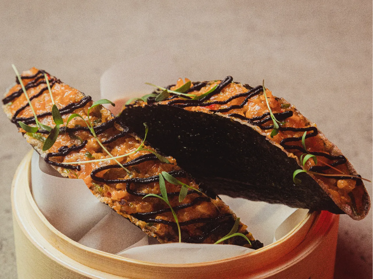 Pancitos Crocantes al Vapor, Burger se Atún, Tártara de Ají Amarillo y Tomate Tsu.