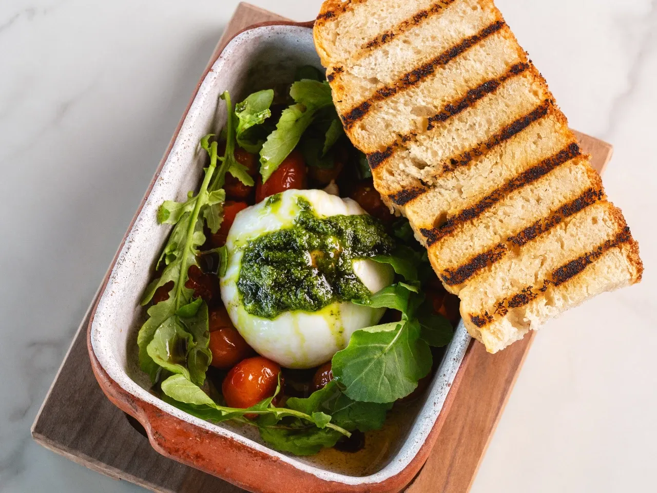 Burrata fresca, tomates cherry confitados, mix verde, pesto, y reducción de balsámico. (Incluye focaccia)