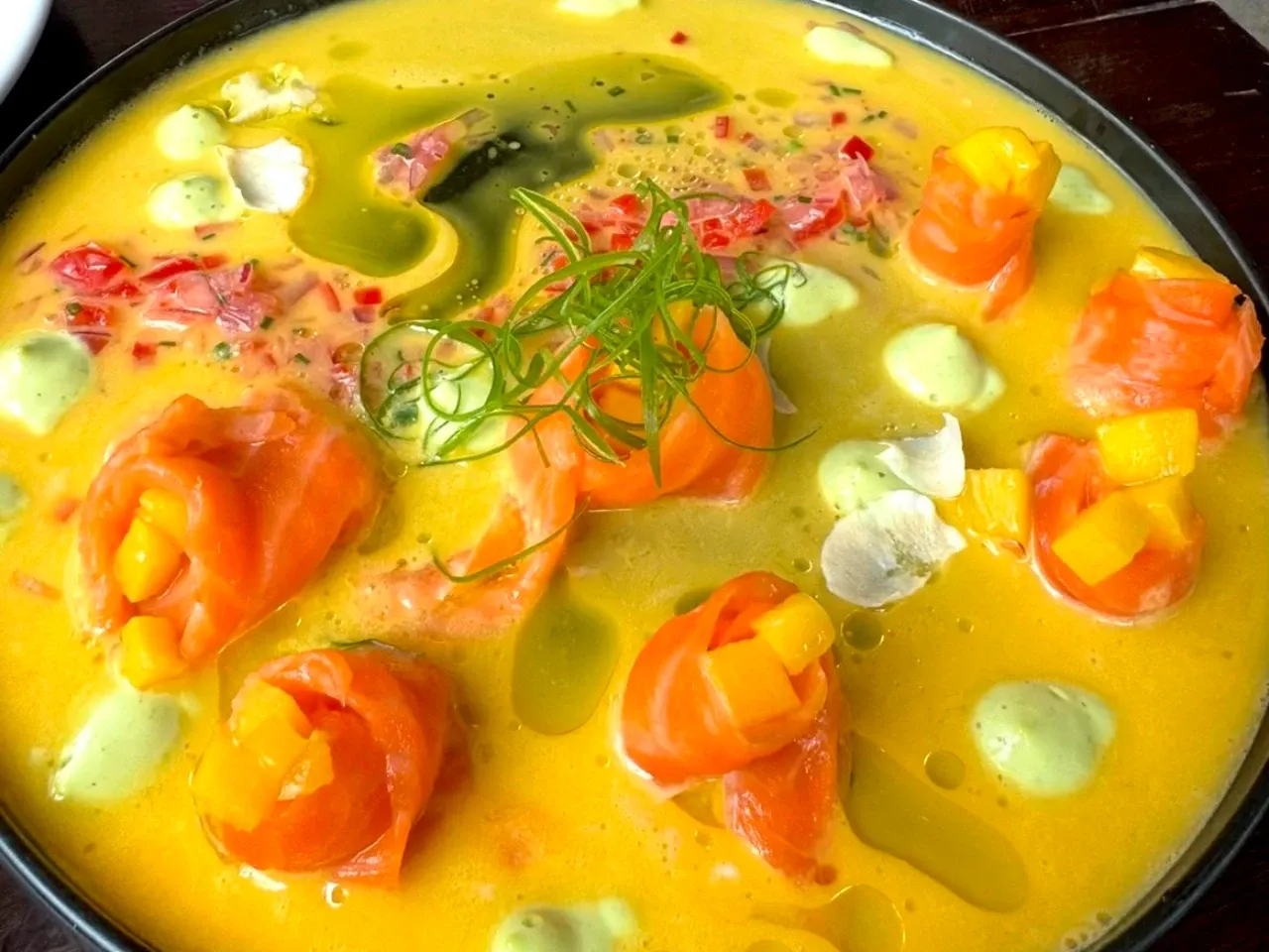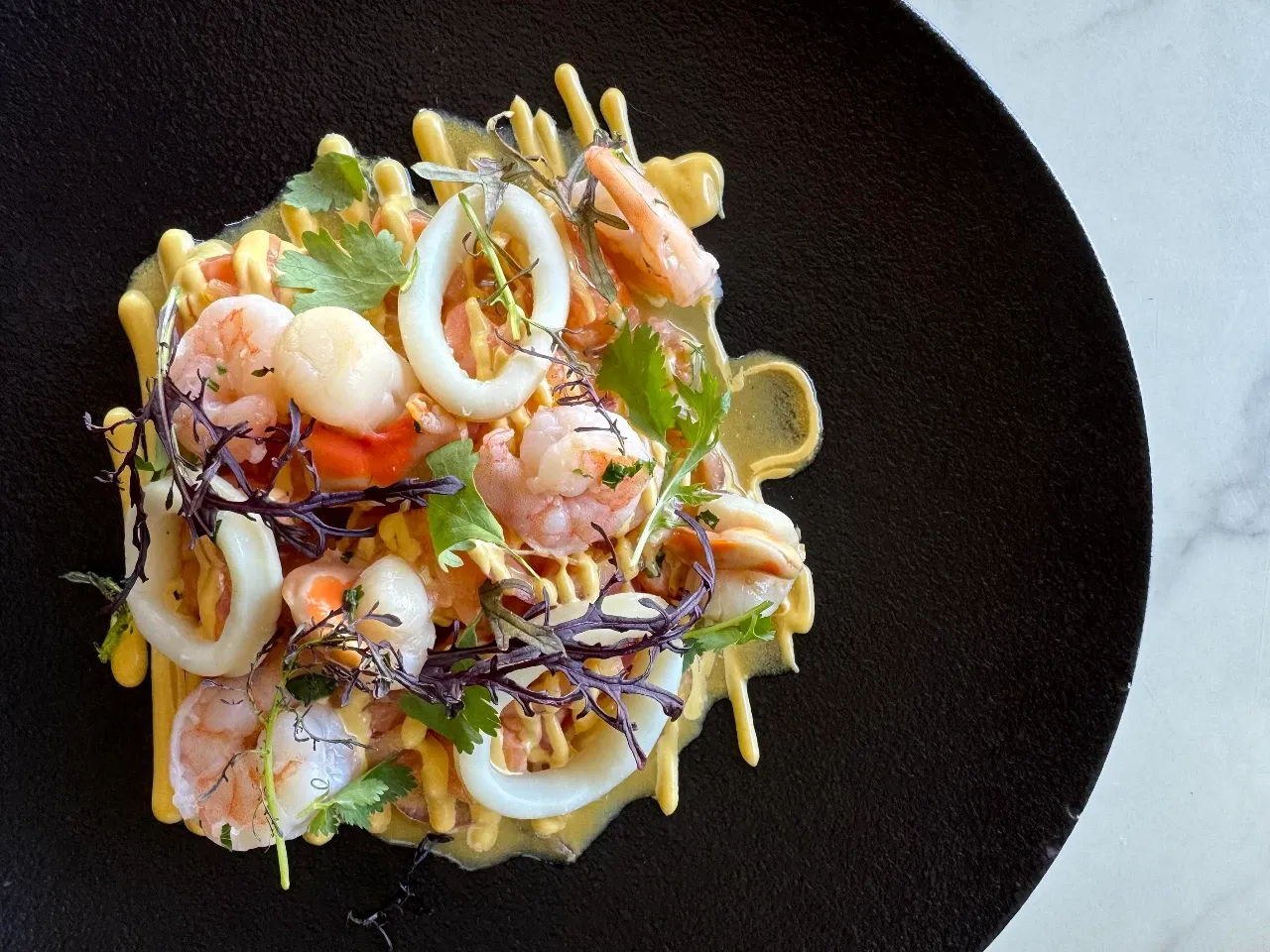 cortes de salmon y camaron aderezados en leche de tigre con aji amarillo, emulsion de papa camote, cebolla morada y cilantro
