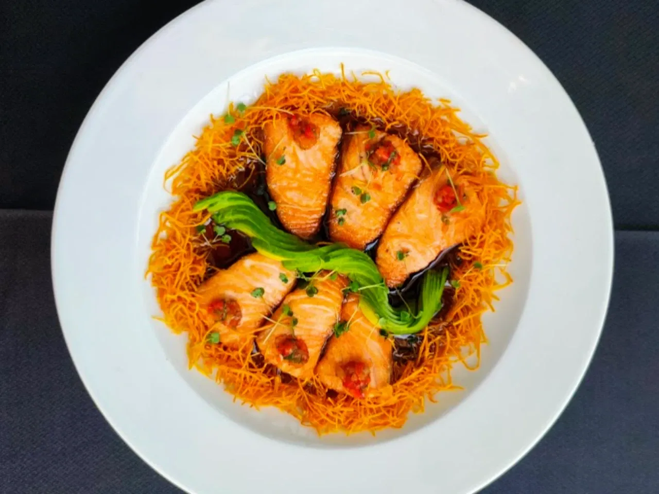 Laminas de salmón rosado, miel de maracuyá, brotes hidropónicos y hilos de camote andino