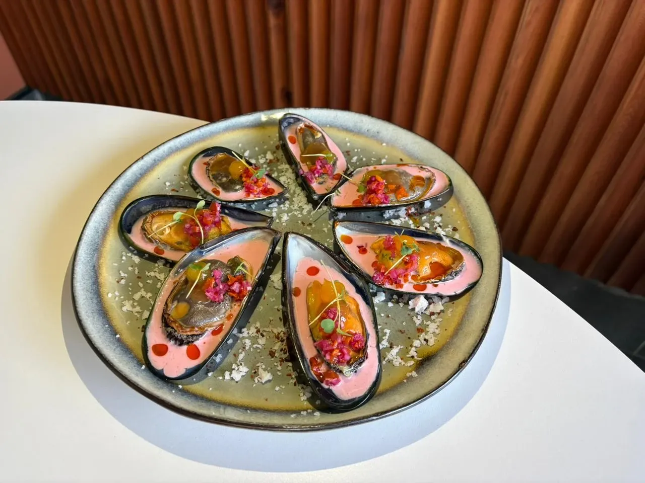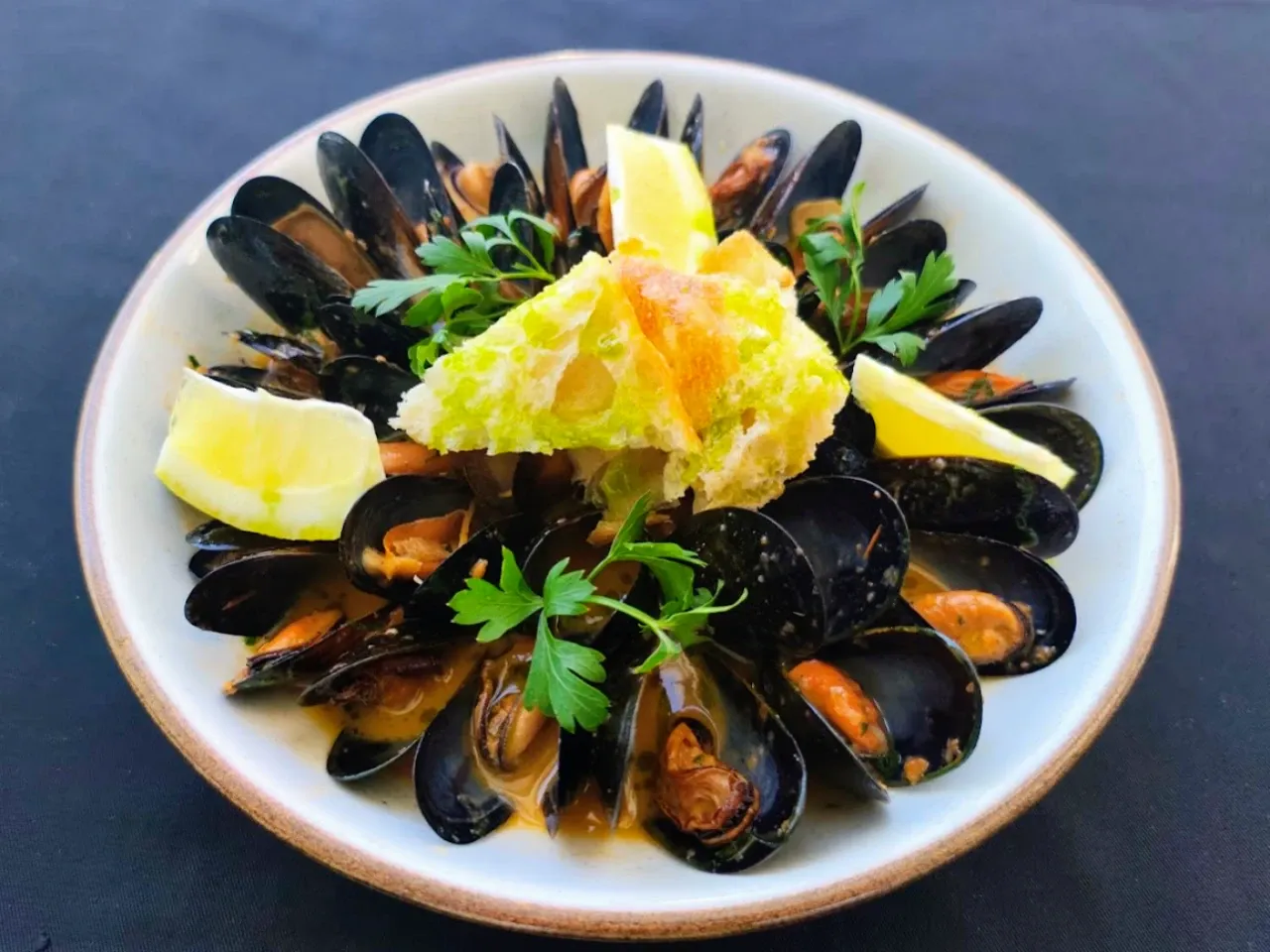SELECCIÓN DE MEJILLONES DE TEMPORADA EN AJO PEREJIL , APAGADOS CON VINO BLANCO Y PEREJIL CRESPO ACOMPAÑADO DE LAMINAS DE PAN DE CAMPO AL OLIVA
