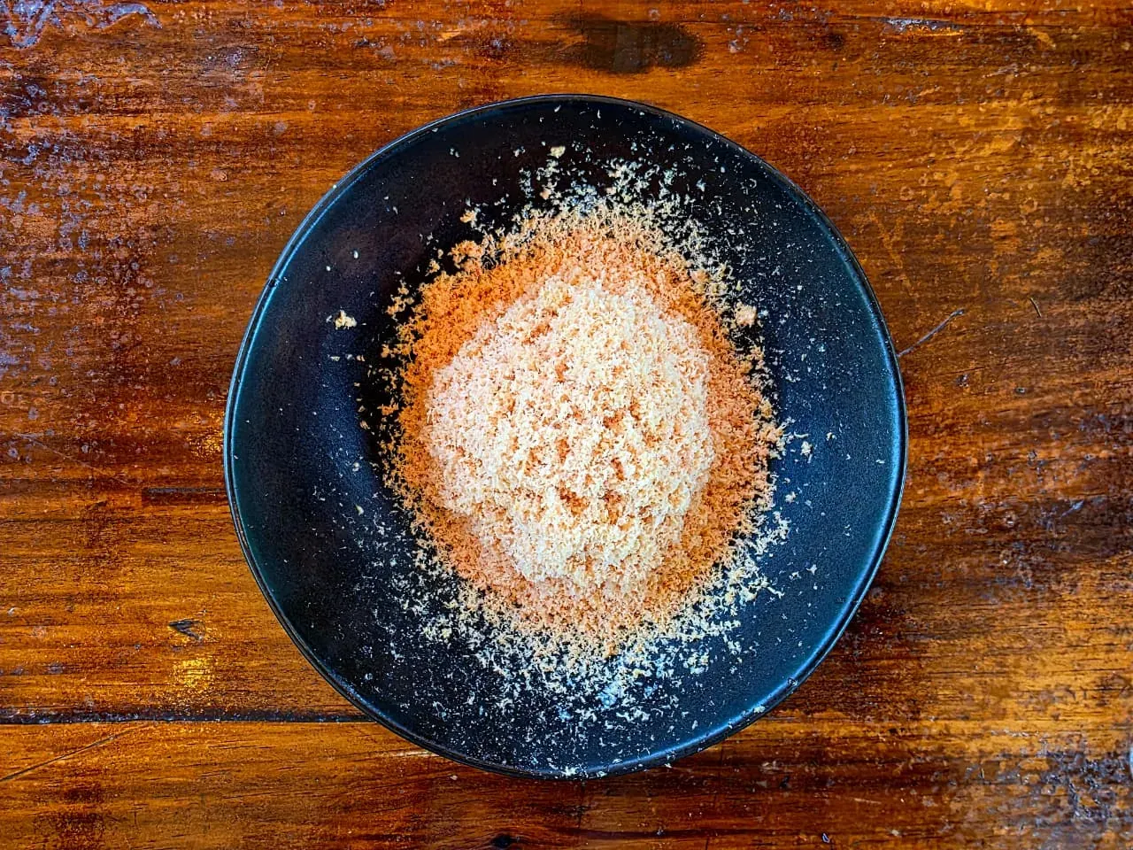Un corazon de costina perfectamente sazonado con farofa, queso parmesano, dressing verde y aceite de sesamo Ideal para un bocado fresco y simple lleno de sabores