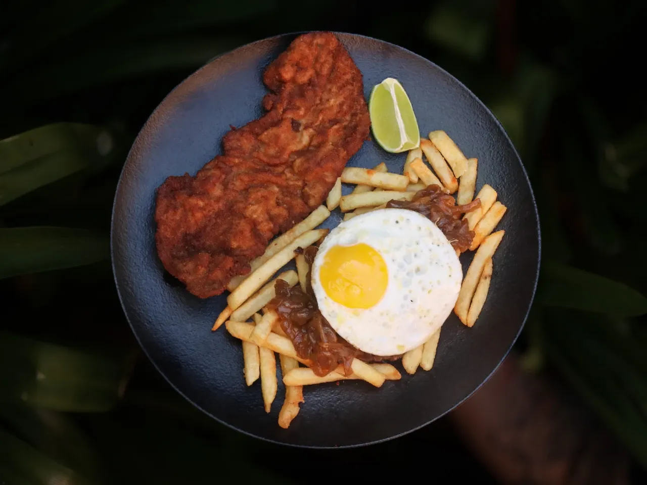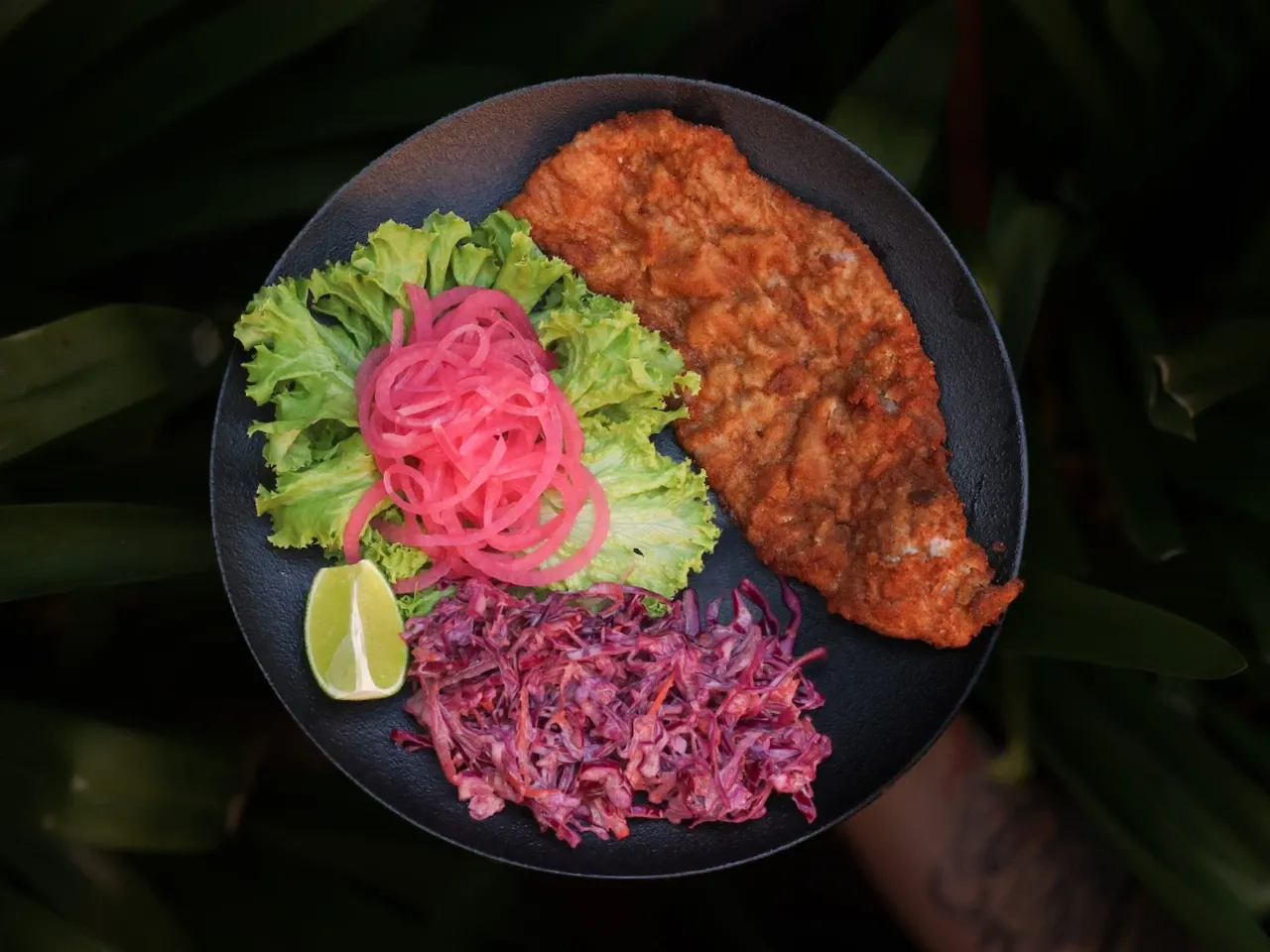 Milanesa de vacuno, acompañada de una ensalada de coleslaw, lechuga hidroponica y cebolla morada encurtida.