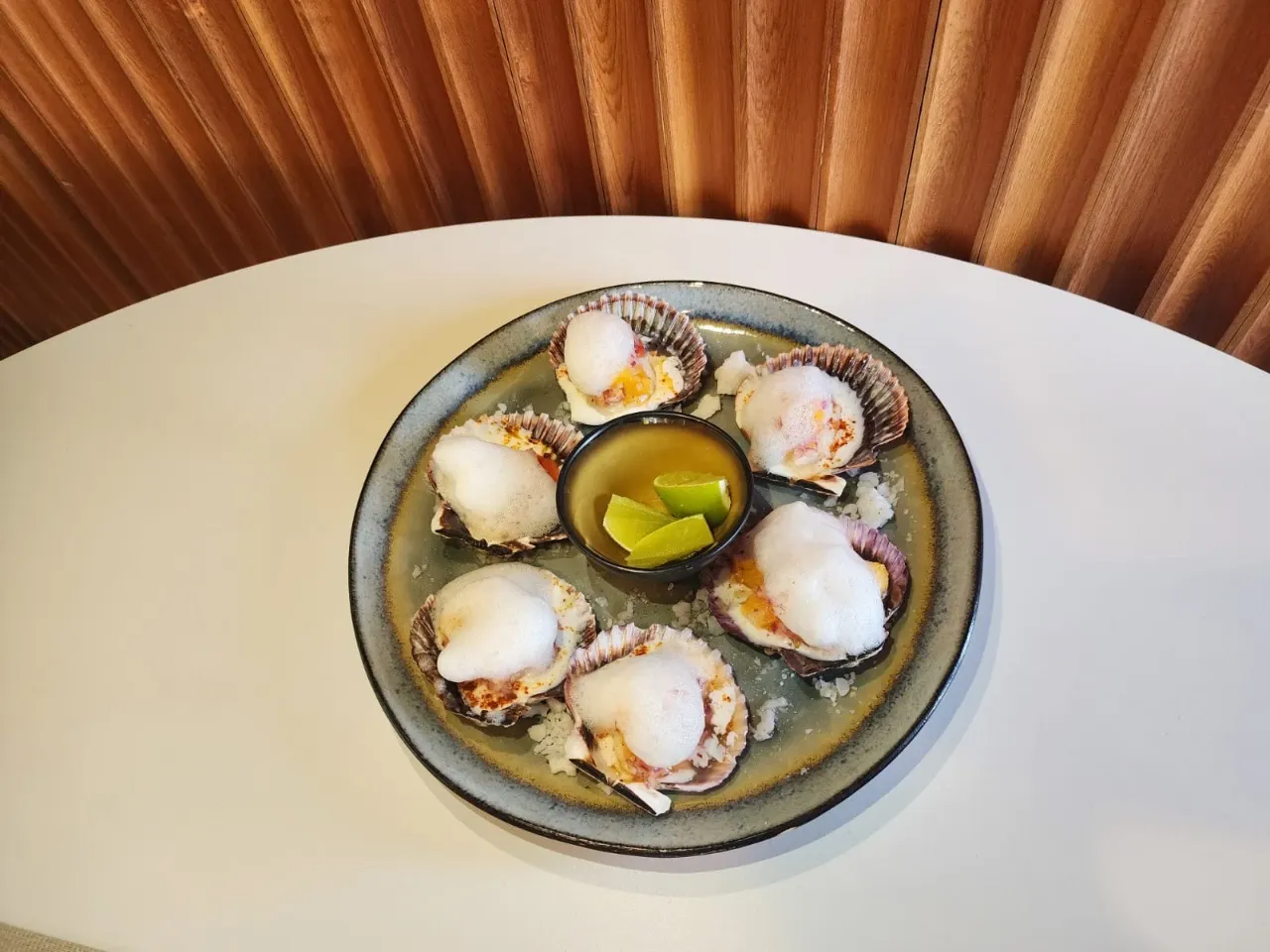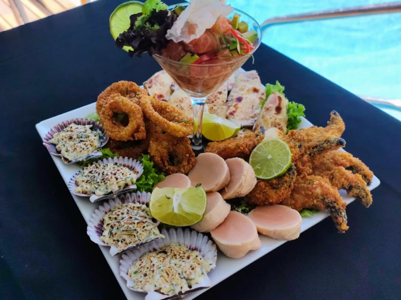 FINA TABLA PARA COMPARTIR CON MARISCOS GRATINADOS MACHAS Y OSTIONES,LOCOS DE TEMPORADA CON ALIOLI, PINZAS DE JAIVA,CALAMARES APANADOS Y CEVICHE DE PESCA FRESCA NIKKEI