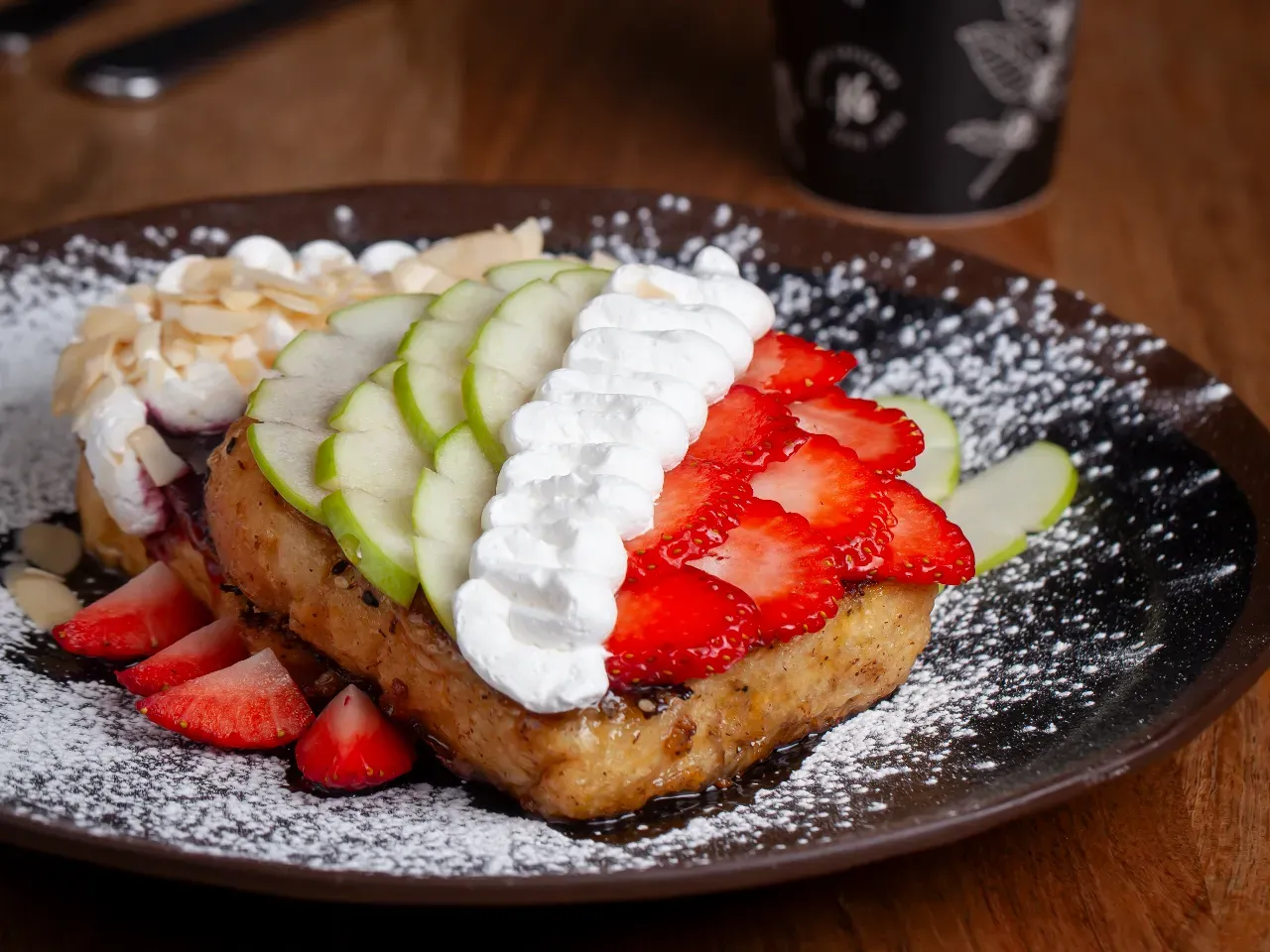 PAN BRIOCHE REVOLSADOS EN NUESTRA MEZCLA ESPECIALMENTE CONDIMENTADA ACOMPAÑADOS DE COMPOTA DE FRUTAS CASERA, CREMA, FRUTA DE LA ESTACION, SYRUP Y MENTA