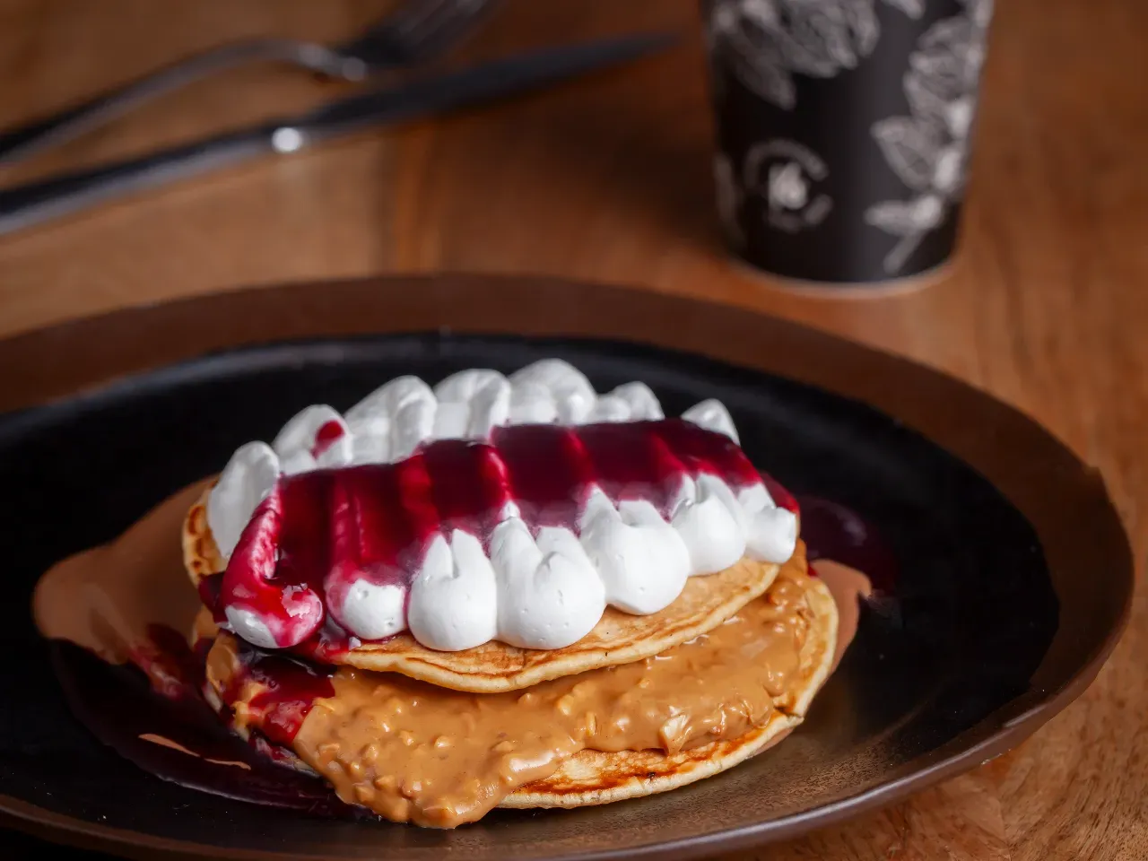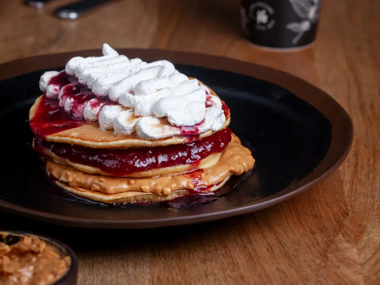 3 Deliciosos pancakes caseros con mantequilla de mani crunchy, crema de avellanas con chocolate y syrup