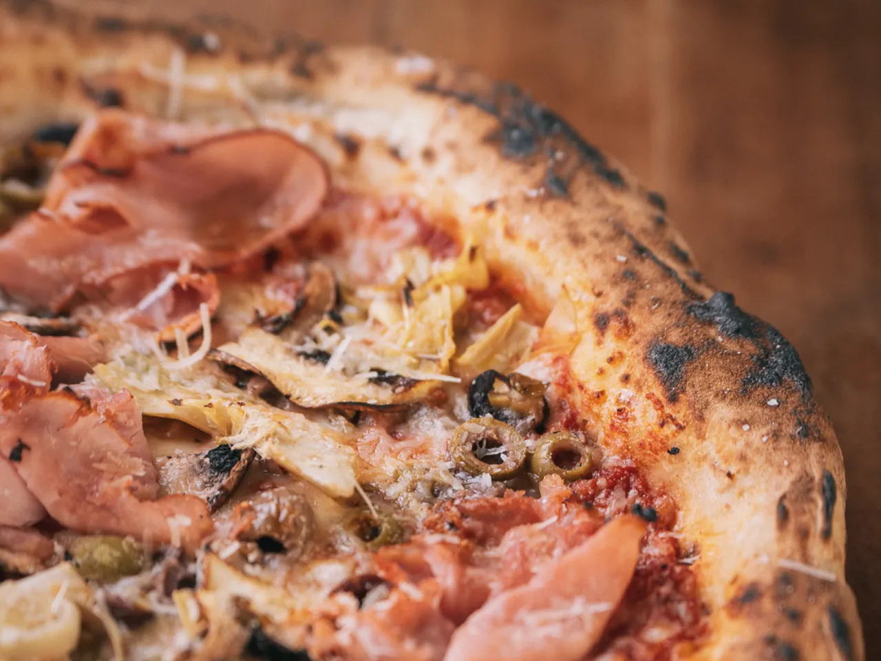 Pomodoro (Italia), mozzarella, Prosciutto Cotto (Jamón selección), corazones de Alcachofa, Aceituna Tre Sappore (Mix de Aceitunas importadas de Italia), champíñón Portobello, Ligeros toques de miel de palma, queso parmesano Grana Padano D.O.P (Italia)