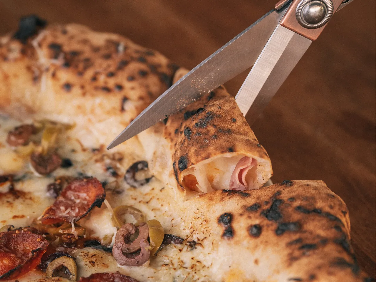 Pizza demi calzone (Pizza: Base crema, mozzarella Fior di Latte (Italia), salame picante (Italia), Nduja calabresa (Italia), aceituna Tre Sappore (mix de aceitunas importadas de Italia) (Calzone: Crema, Fior di Latte, Prosciutto Cotto (Jamón selección) y Nduja calabresa)