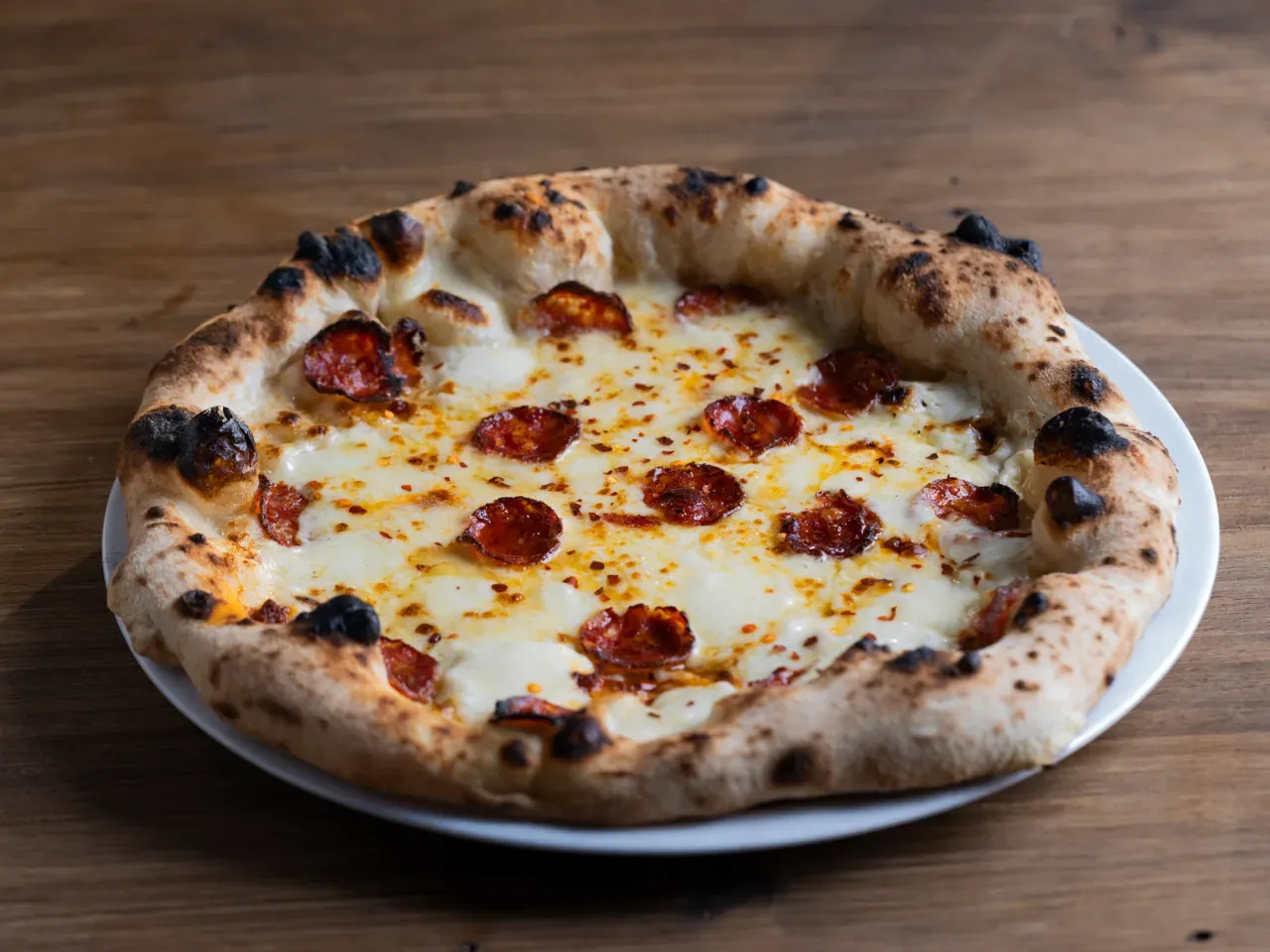 Pizza con base de fondue de queso parmesano Grana Padano, Mozzarella Fior di Latte, Queso Provolone (provoleta), Nduja, Salame picante y toques de Peperoncinno.