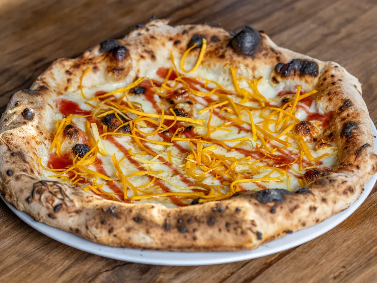 Pizza con Queso Mozzarella, Queso Provolone, Queso Mozzarella Fior Di Latte y Queso de Cabra. Toques de frutilla al limón con hilos crocantes de camote.