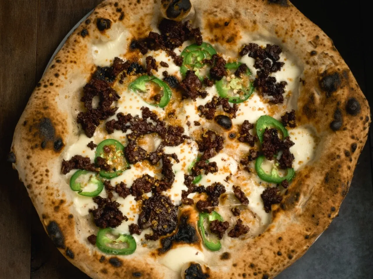 Pizza con base de Mozzarella Fior di Latte, Prieta, Jalapeños y un toque de quínoa crocante