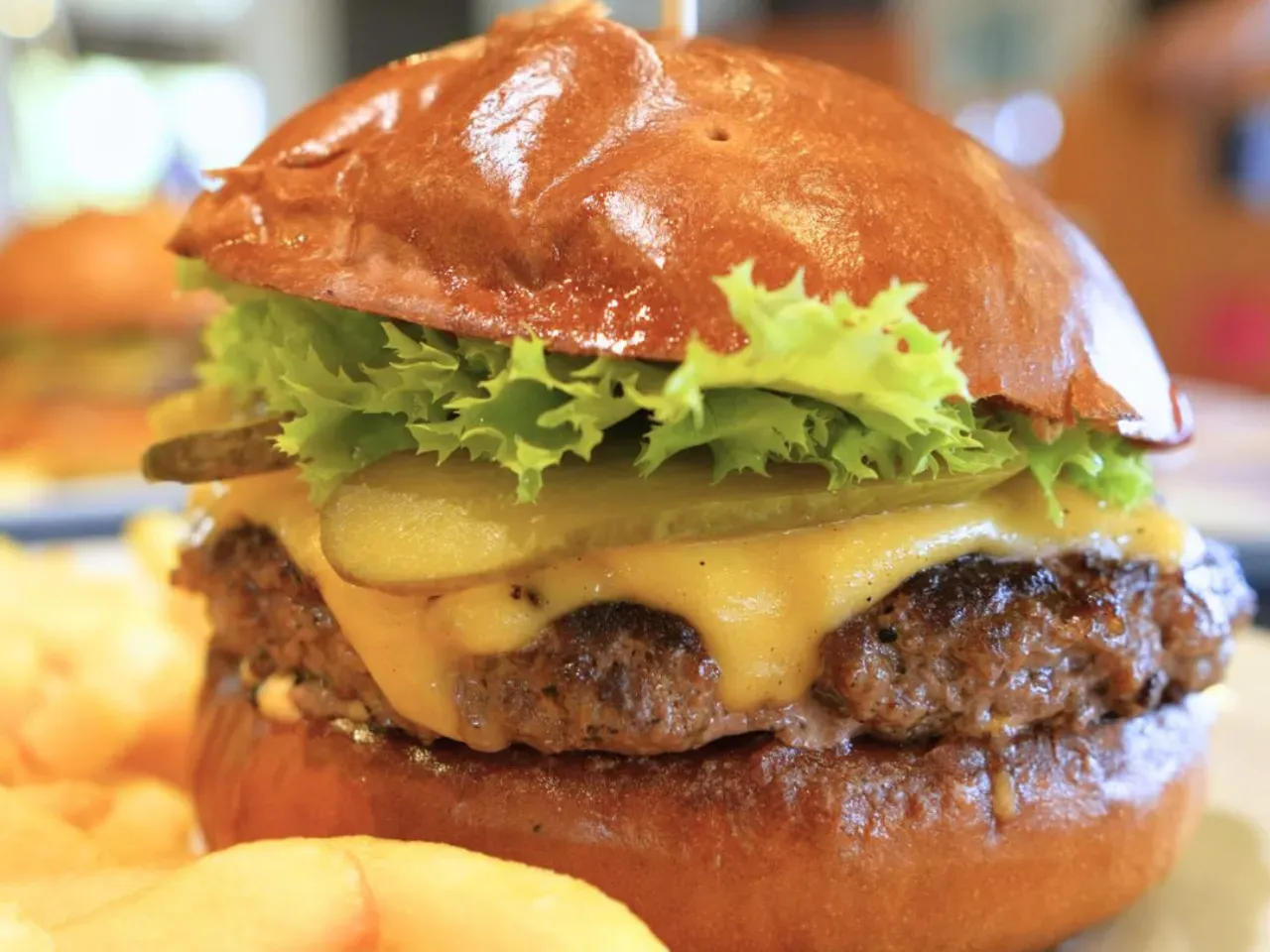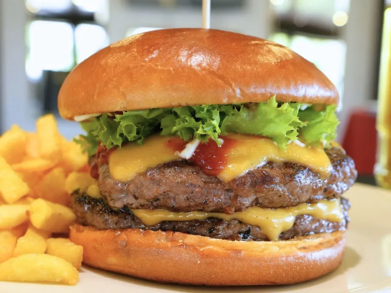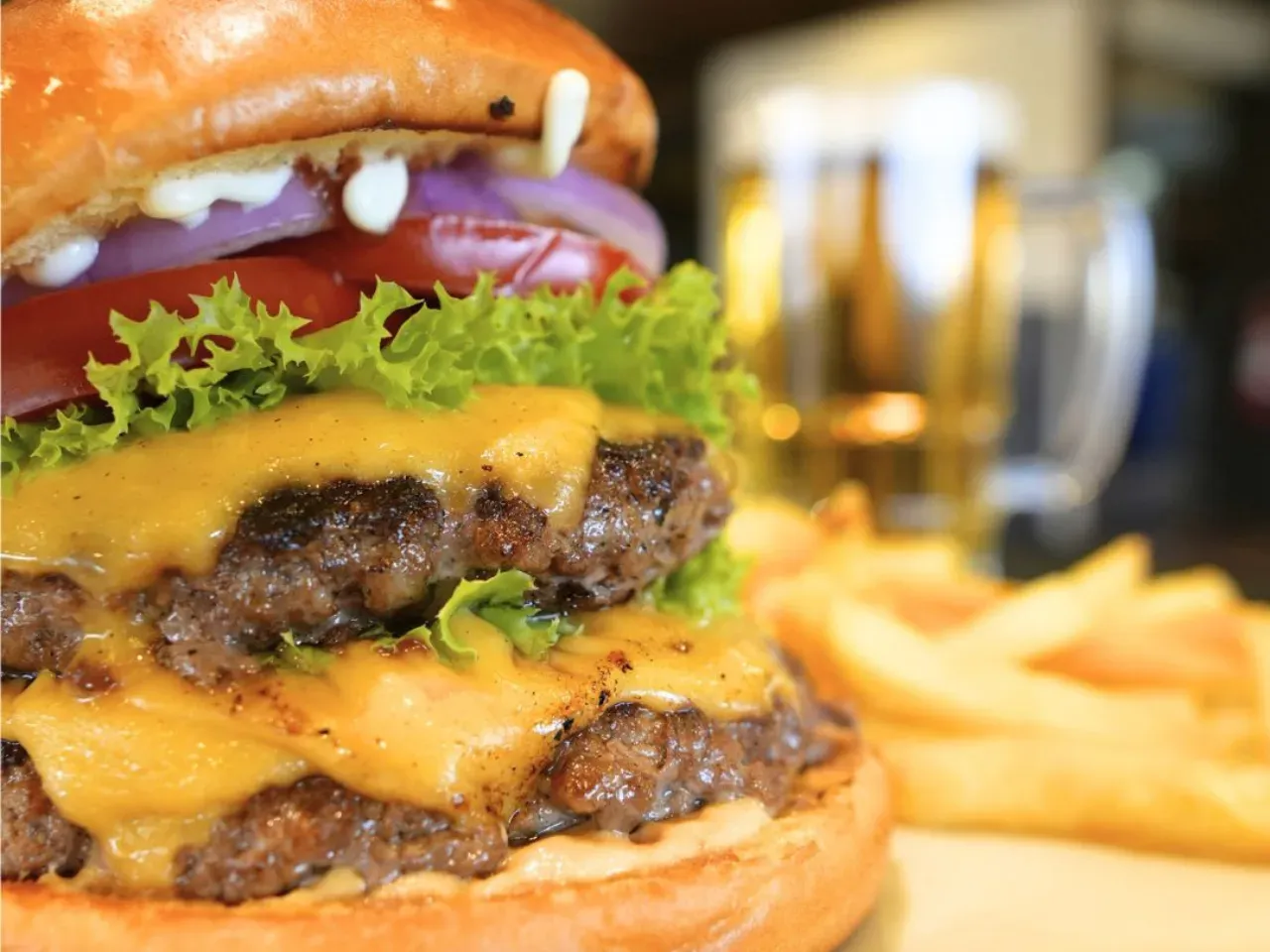 Dos jugosas carnes de vacuno (180g U), doble queso cheddar derretido, tomate fresco, cebolla morada, pepinillos, lechuga crujiente y nuestra exclusiva salsa Piccola (una creacion especial de la casa). Complementada con salsas tradicionales (Ketchup, Mayo y BBQ). Acompañada de crujientes papas fritas (150g).