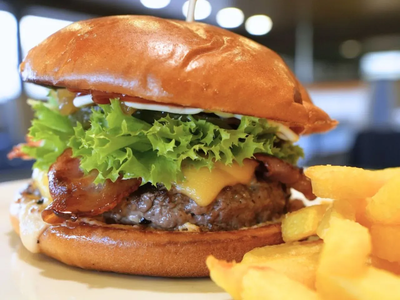 Carne de vacuno (180g) coronada con queso cheddar derretido, tocino crujiente, pepinillos, lechuga fresca y nuestra exclusiva salsa Piccola (una creacion especial de la casa). Completada con las salsas tradicionales (Ketchup, Mayo y BBQ) para un sabor irresistible, acompañada de nuestras crujientes papas fritas (150g).