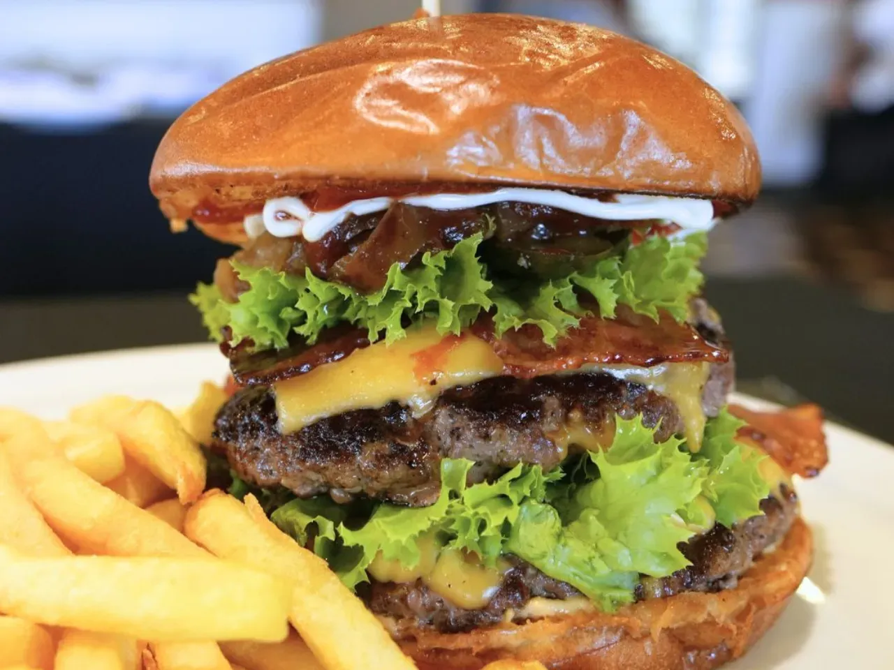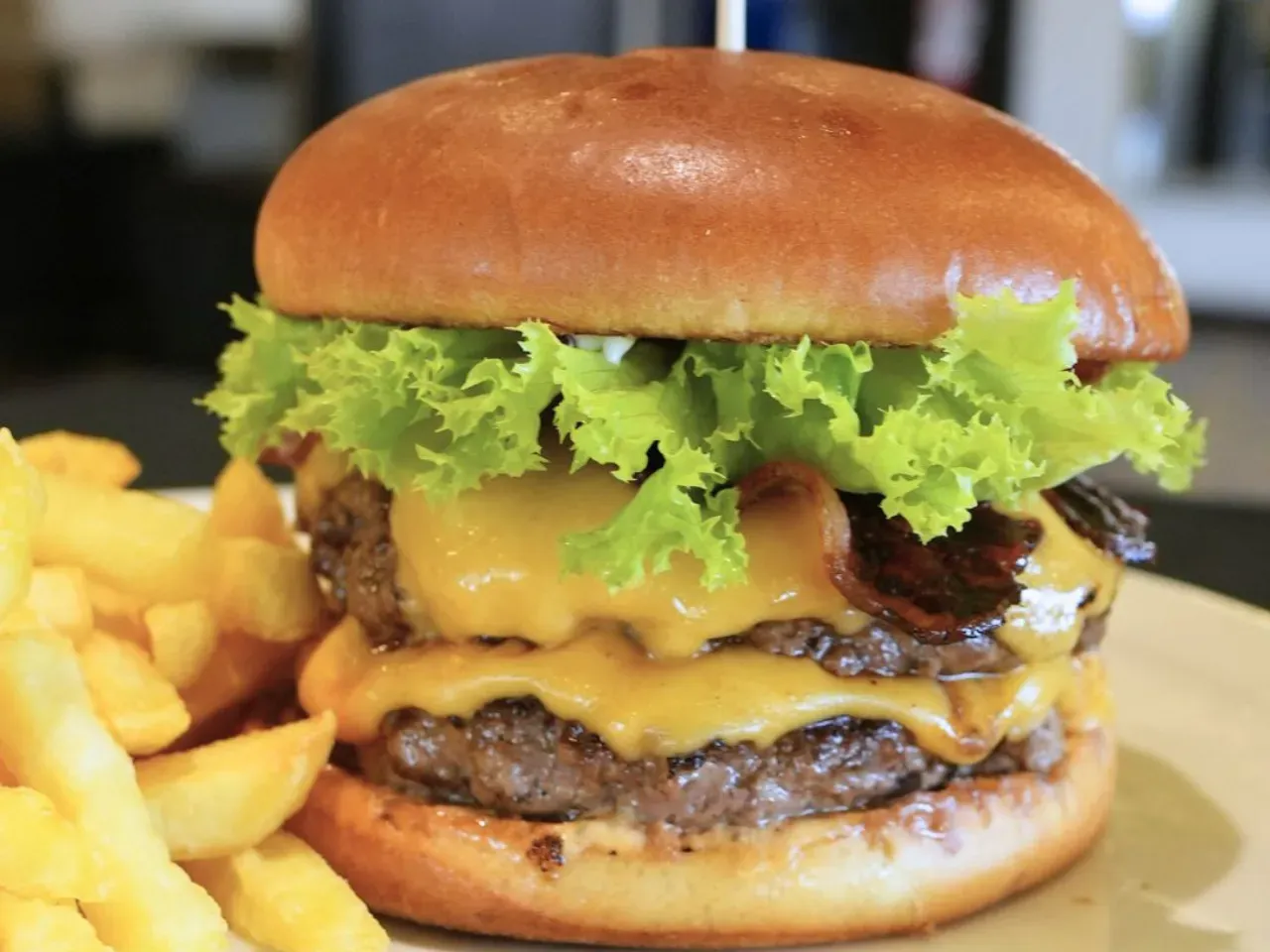 Dos jugosas carnes de vacuno (180g U), doble queso cheddar derretido, doble tocino crujiente, pepinillos, lechuga crujiente y nuestra exclusiva salsa Piccola (una creacion especial de la casa). Complementada con salsas tradicionales (Ketchup, Mayo y BBQ). Acompañada de crujientes papas fritas (150g).