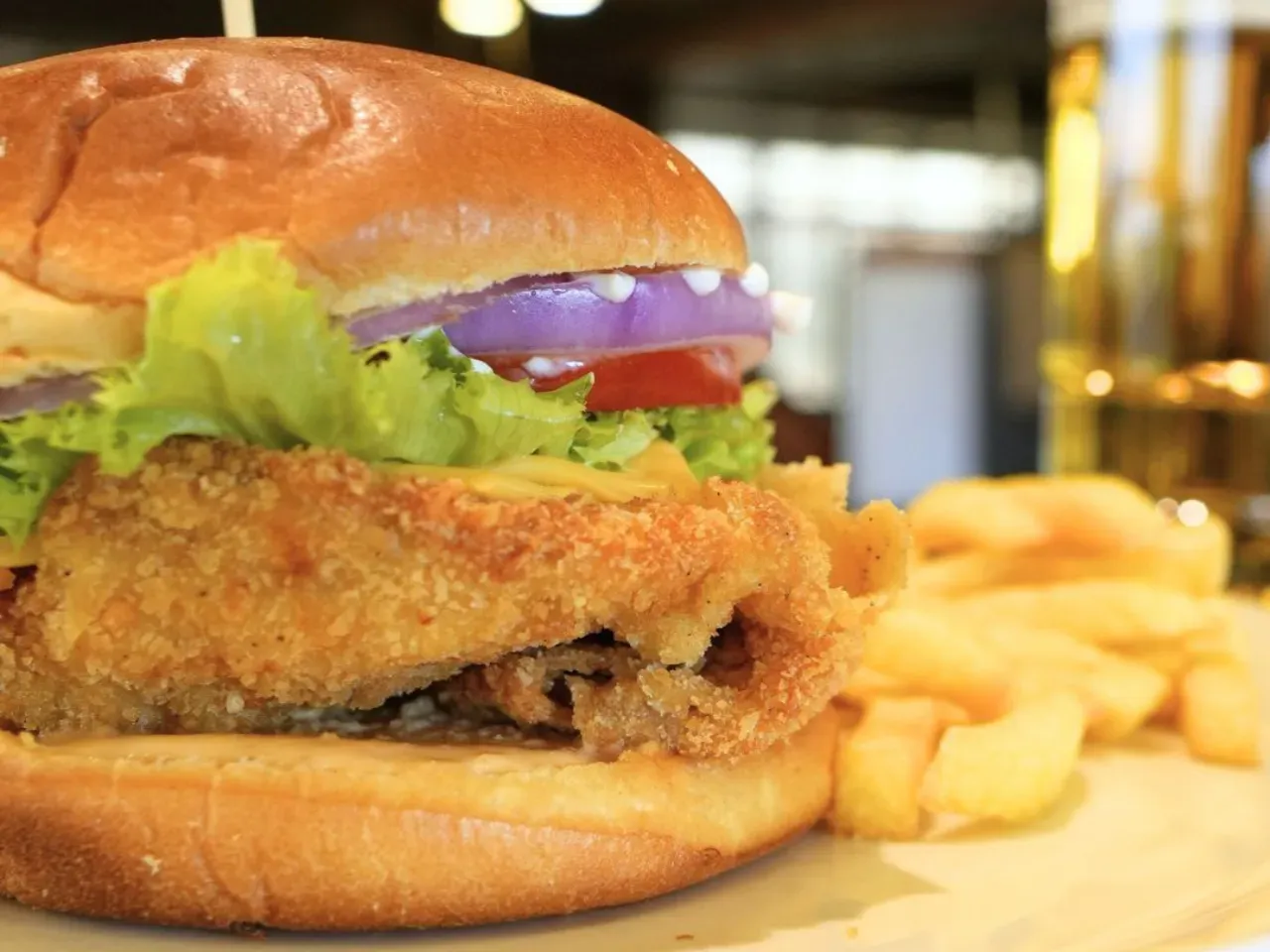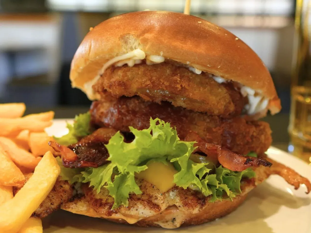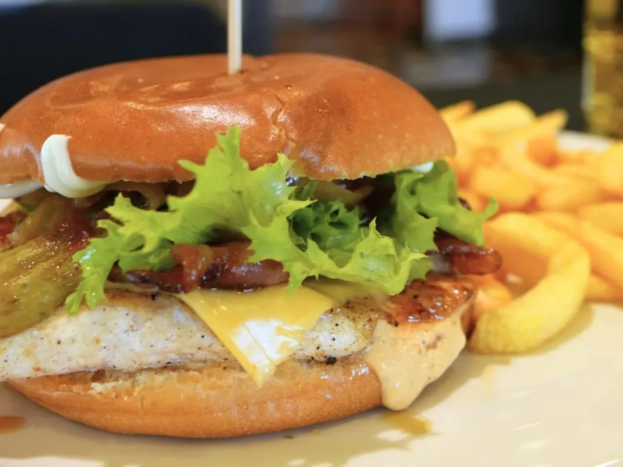 Jugoso pollo a la plancha (200g) con queso cheddar derretido, crujientes aros de Milan, tocino, pepinillos, lechuga fresca y nuestra exclusiva salsa Piccola (una creacion especial de la casa). Complementada con salsas tradicionales (Ketchup, Mayo y BBQ). Acompañada de crujientes papas fritas (150g).