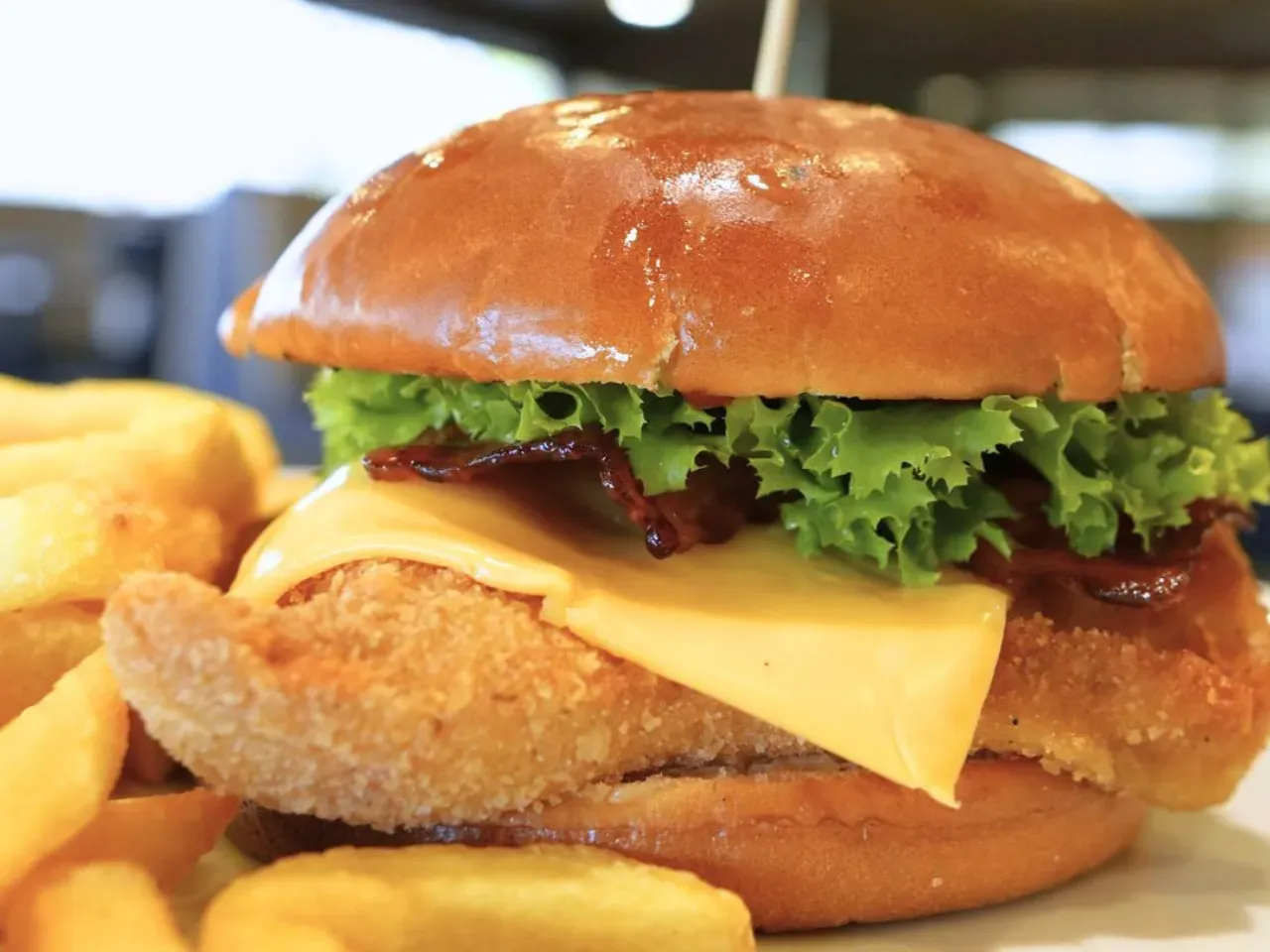 Crujiente pollo apanado (150g) coronado con queso cheddar derretido, tocino crujiente, pepinillos, lechuga fresca y nuestra exclusiva salsa Piccola (una creacion especial de la casa). Completada con las salsas tradicionales (Ketchup, Mayo y BBQ) para un sabor irresistible, acompañada de nuestras tradicionales papas fritas (150g).